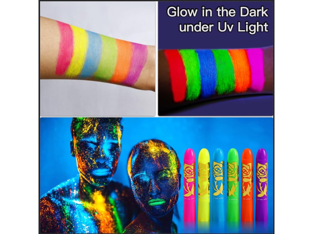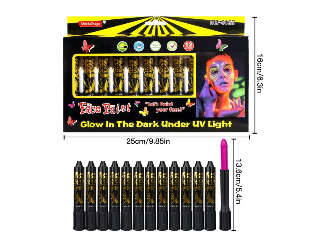 Sada 12 neonových barev na obličej a tělo, které svítí pod UV světlem. Snadno se nanáší a smývá. Ideální pro párty, Halloween a cosplay.