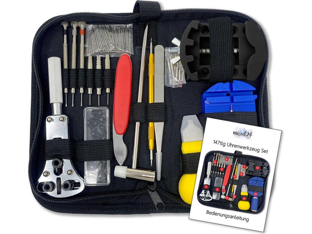 Tato 147tlg sada nářadí pro hodináře je ideální pro základní opravy údržbu a výměnu baterií hodinek. Obsahuje vše potřebné jako je otevírač pouzder, zkracovač řemínků, šroubováky, nástroje na stěžejky a celkem 108 kusů náhradních stěžejek. Vše je uloženo v nylonovém pouzdře pro snadné přenášení a organizaci.