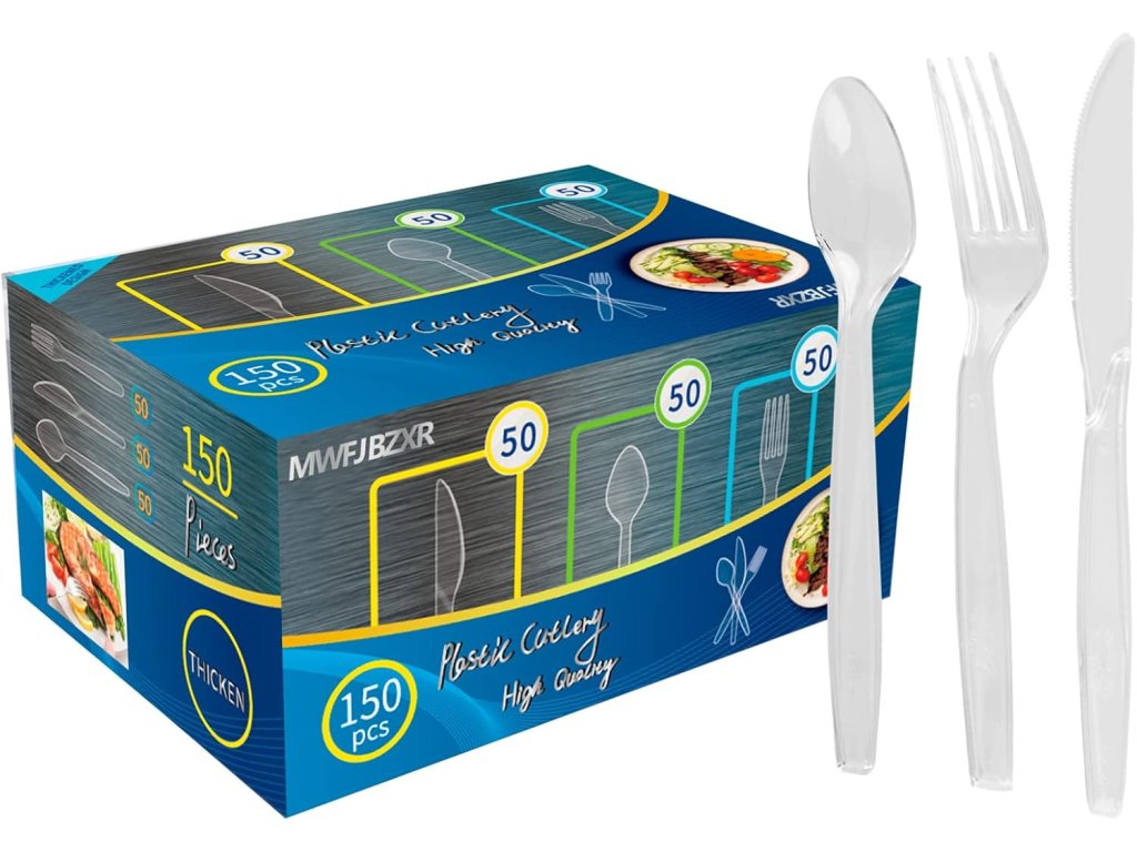 Ekonomická a praktická sada 150 průhledných opakovaně použitelných plastových příborů (50 vidliček, 50 nožů, 50 lžic), bez BPA, s certifikací LFGB pro styk s potravinami.