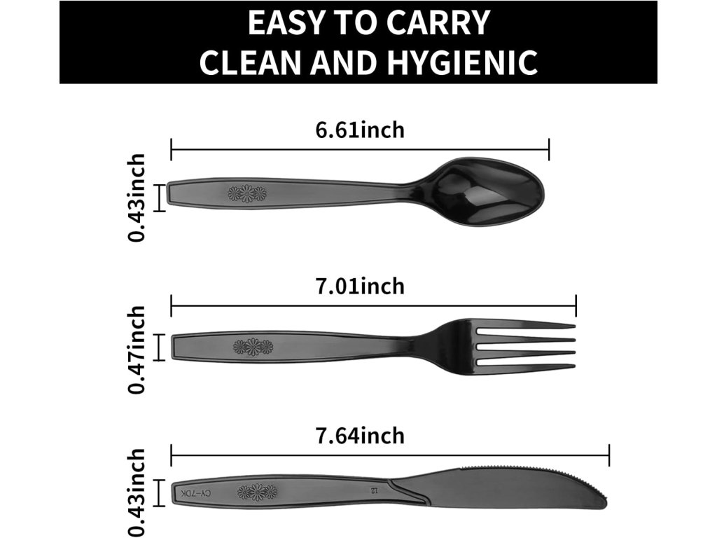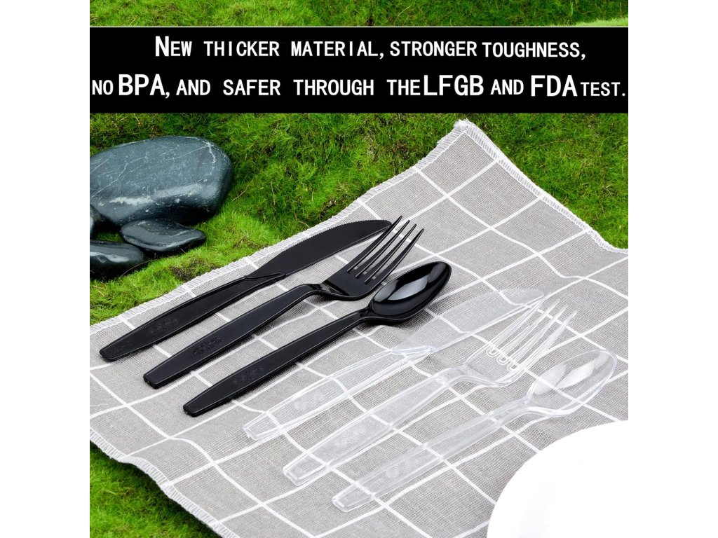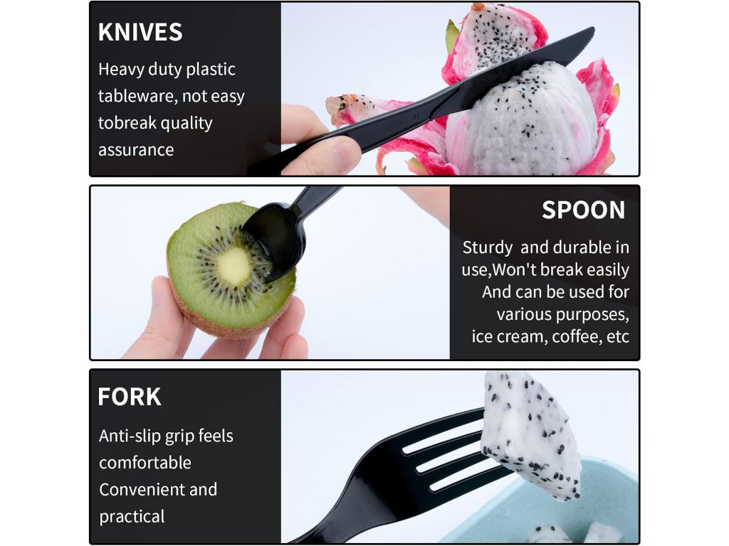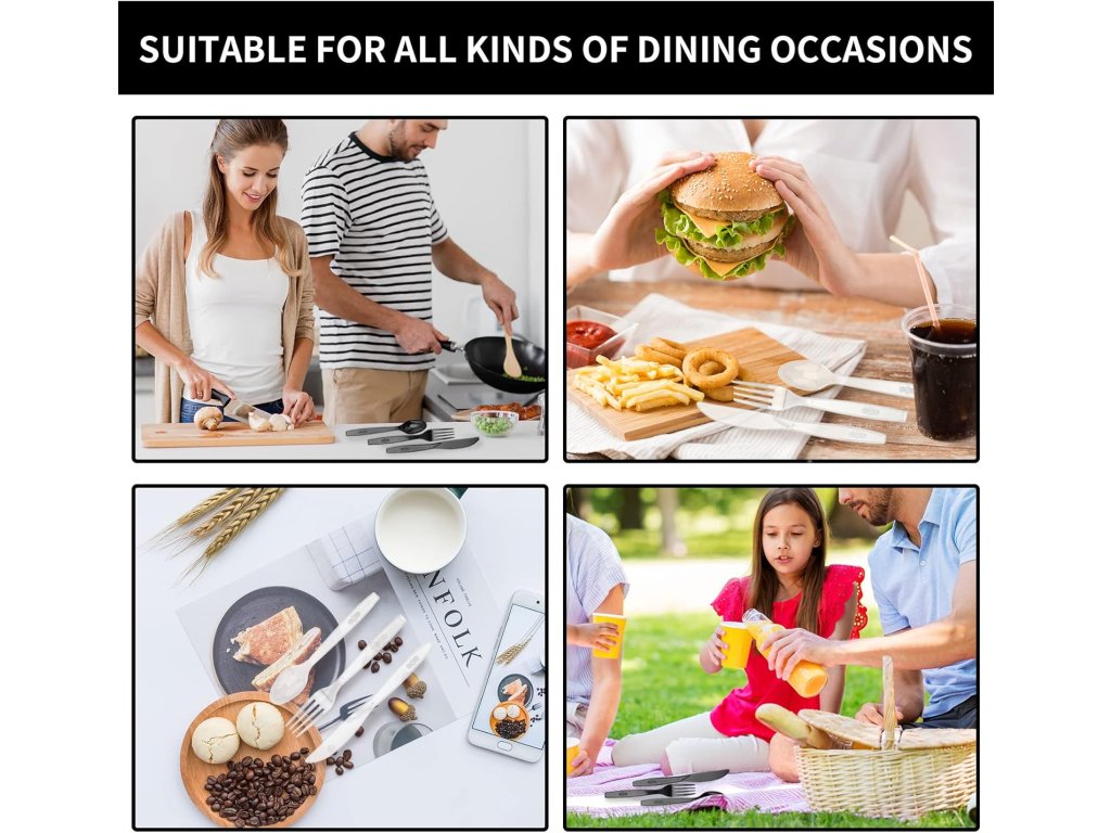 Příbory jsou vyrobeny z vysoce kvalitního, bezpečného materiálu bez obsahu BPA. Jsou pevné a robustní, při propichování potravin se snadno nelámou a vyznačují se dlouhou životností. Díky svému modernímu a trendy vzhledu jsou vhodné pro širokou škálu příležitostí, jako jsou svatební hostiny, obědové bufety, večírky, grilování a aktivity u bazénu. Lze je s výhodou použít i při větších oslavách.