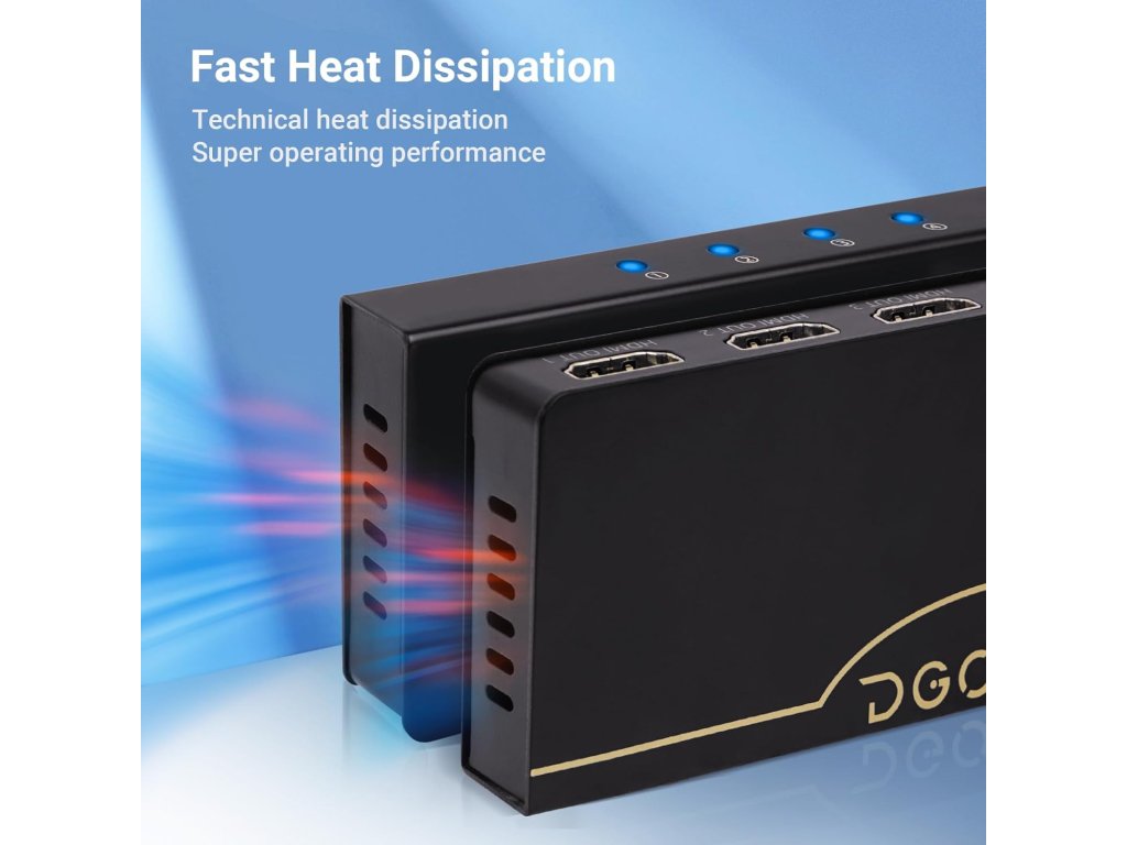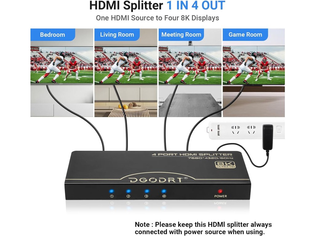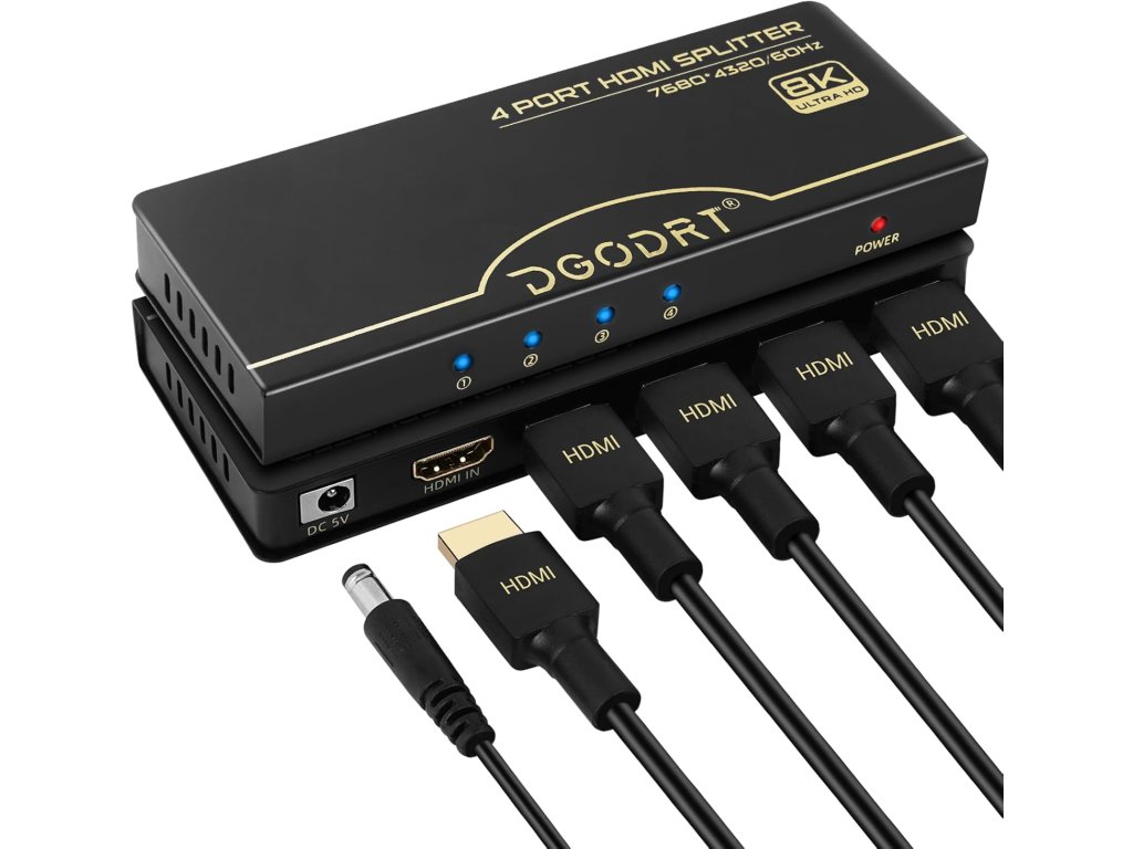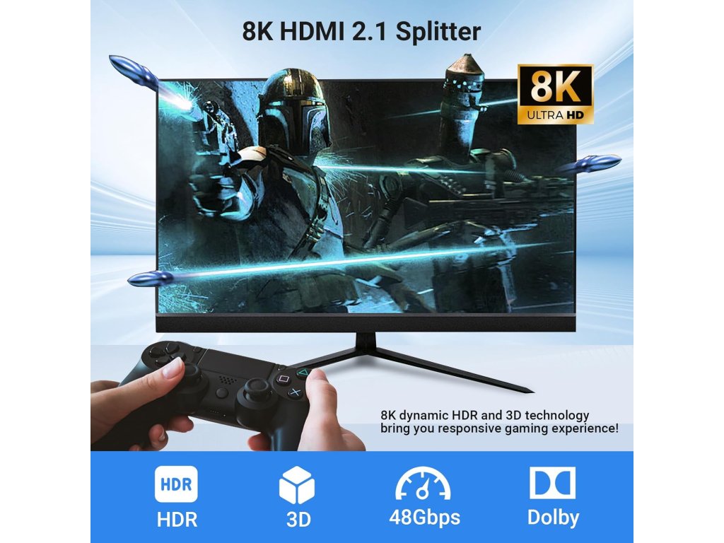 Tento 8K HDMI 2.1 rozbočovač s jedním vstupem a čtyřmi výstupy současně zrcadlí nebo kopíruje jeden HDMI zdroj signálu na až čtyři HD výstupní displeje bez ztráty kvality obrazu a zvuku. Podporuje automatické i nucené snížení rozlišení (downscaling). Umožňuje přenos v rozlišení 8K při 60Hz, 4K při 120Hz a 1080P při 240Hz, a dokonce podporuje současnou práci s různými rozlišeními 8K a 4K. Je kompatibilní s HDMI 2.1, HDCP 2.3, Dolby Vision a vysokorychlostní video přenosovou šířkou pásma 48 Gbps (podporuje i 40 Gbps). Díky nejnovějšímu čipu a externímu napájení DC 5V zajišťuje rychlý a stabilní přenos video a audio signálu. Celokovové pouzdro zaručuje odolnost. Rozbočovač je plně kompatibilní s PC, Roku 4, PS5, Xbox, Blu-ray přehrávači, projektory, monitory a operačními systémy Windows, Mac OS a Linux.