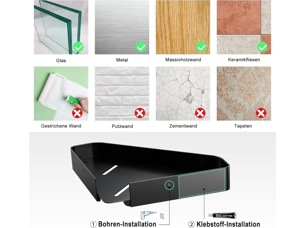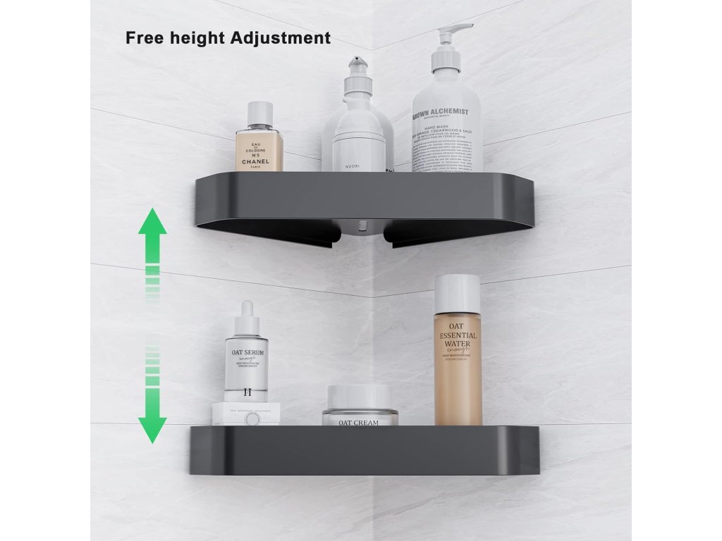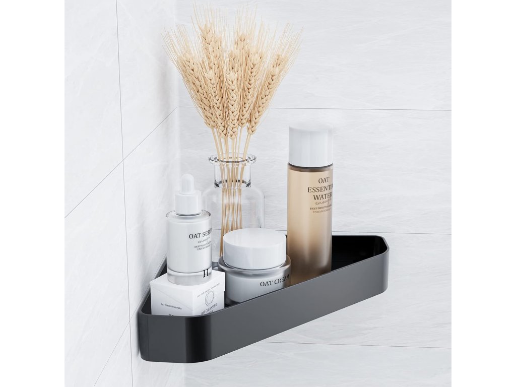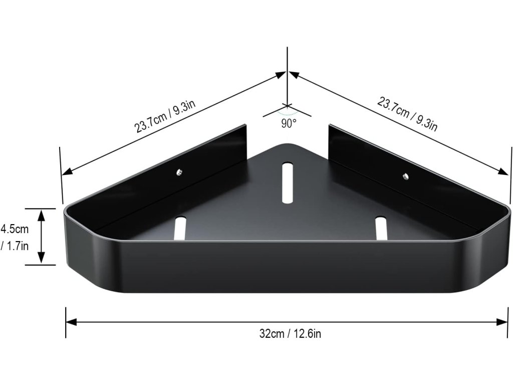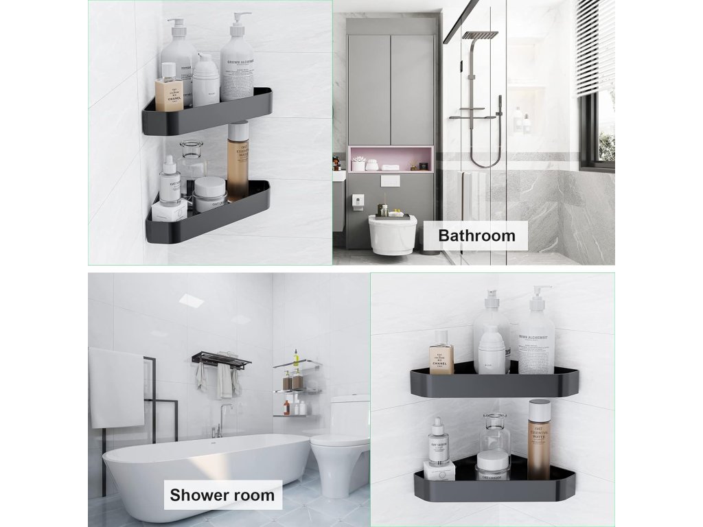 Praktická sada 2 černých rohových sprchových polic Aikzik pro bezvrtné upevnění. Vyrobeno z odolného hliníku s eloxovanou povrchovou úpravou, odolné proti korozi a poškrábání. Vodotěsný design s odtokovými otvory pro rychlé schnutí. Instalace pomocí super silného lepidla s vysokou nosností až 20 kg na polici. Vhodné pro pravoúhlé rohy 90°. Snadná montáž bez poškození zdi (možnost i vrtání s dodaným příslušenstvím). Ideální pro uložení šamponů, sprchových gelů a dalších koupelnových potřeb.
