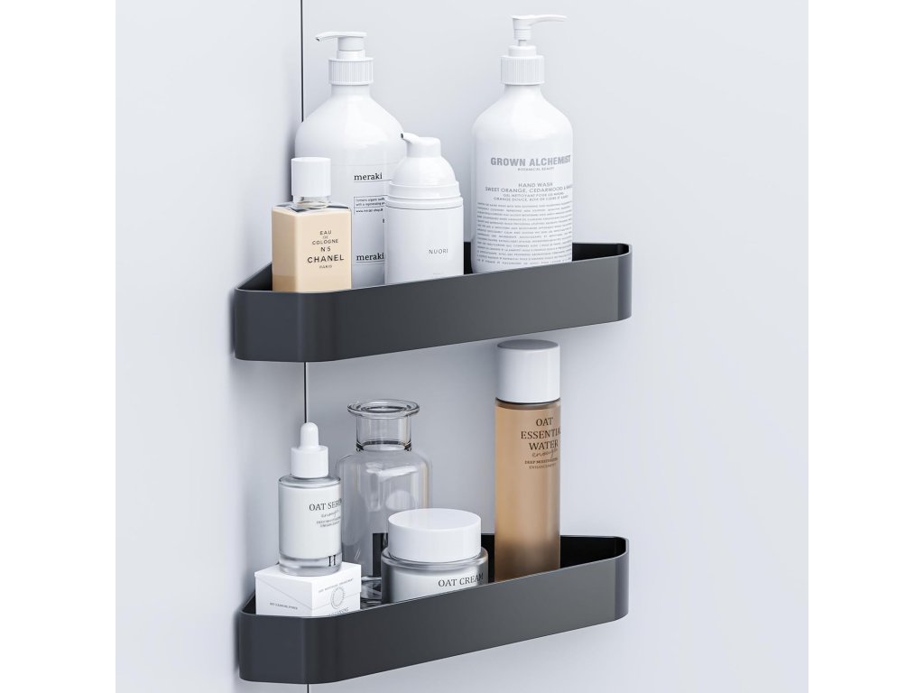 2dílná černá rohová sprchová police Aikzik bez vrtání. Hliníková, vodotěsná, nosnost až 20 kg, snadná instalace.