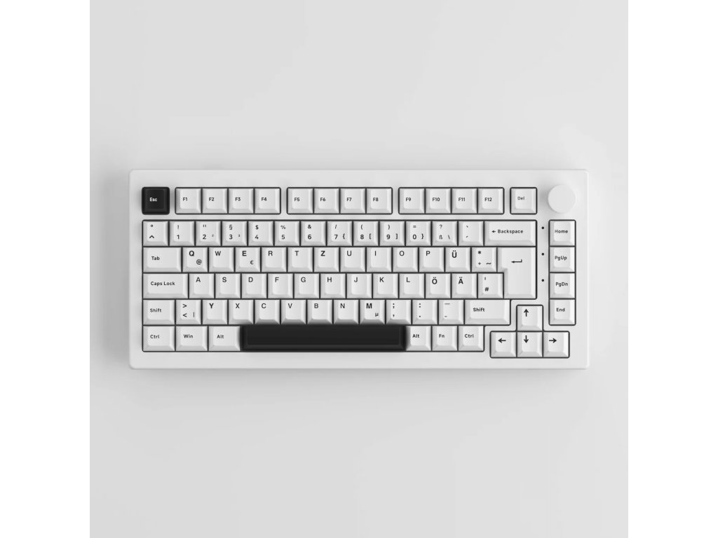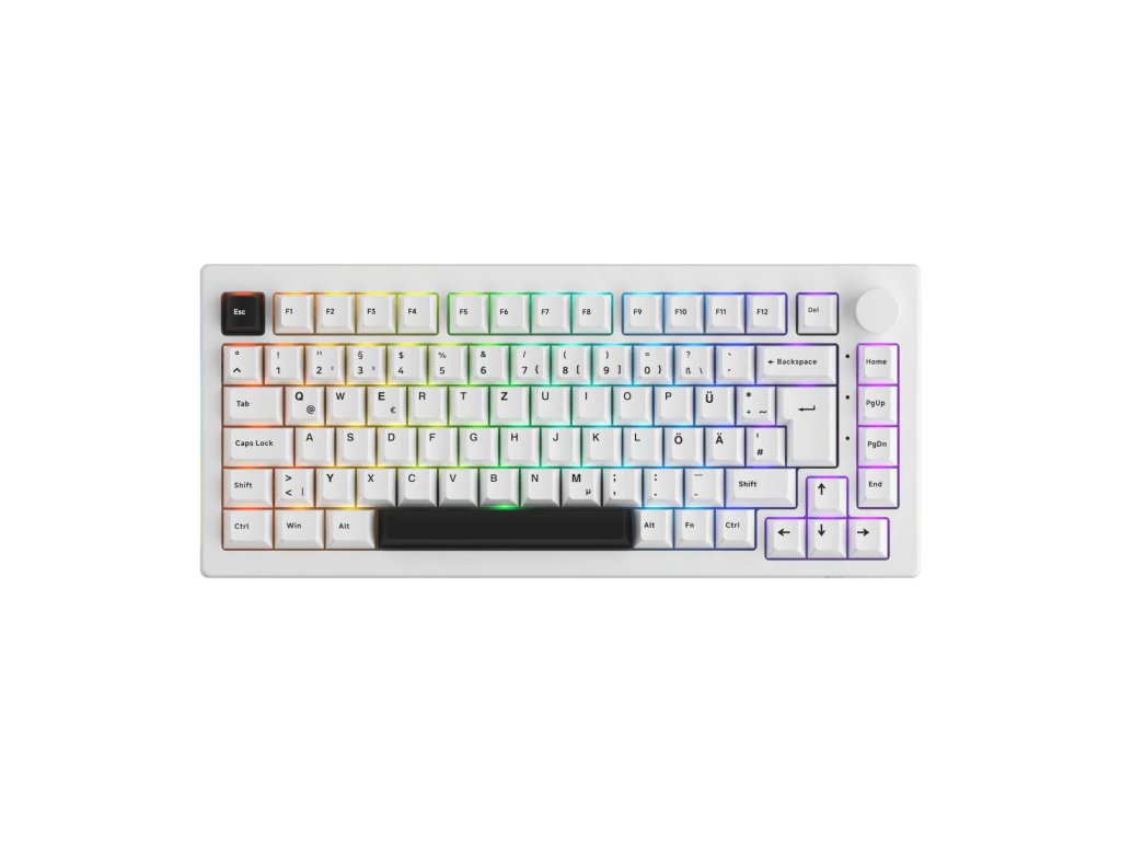 Tahle klávesnice má i speciální otočný knoflík, kterým si můžeš ovládat hlasitost nebo jas podsvícení. A díky tomu, jak je vyrobená (říká se tomu "gasket mount"), se na ní píše moc příjemně a měkce. Klávesy jsou vyrobené z kvalitního PBT plastu, takže se jen tak neopotřebují. Navíc k ní dostaneš i extra klávesy pro německou, britskou a severskou ISO verzi!