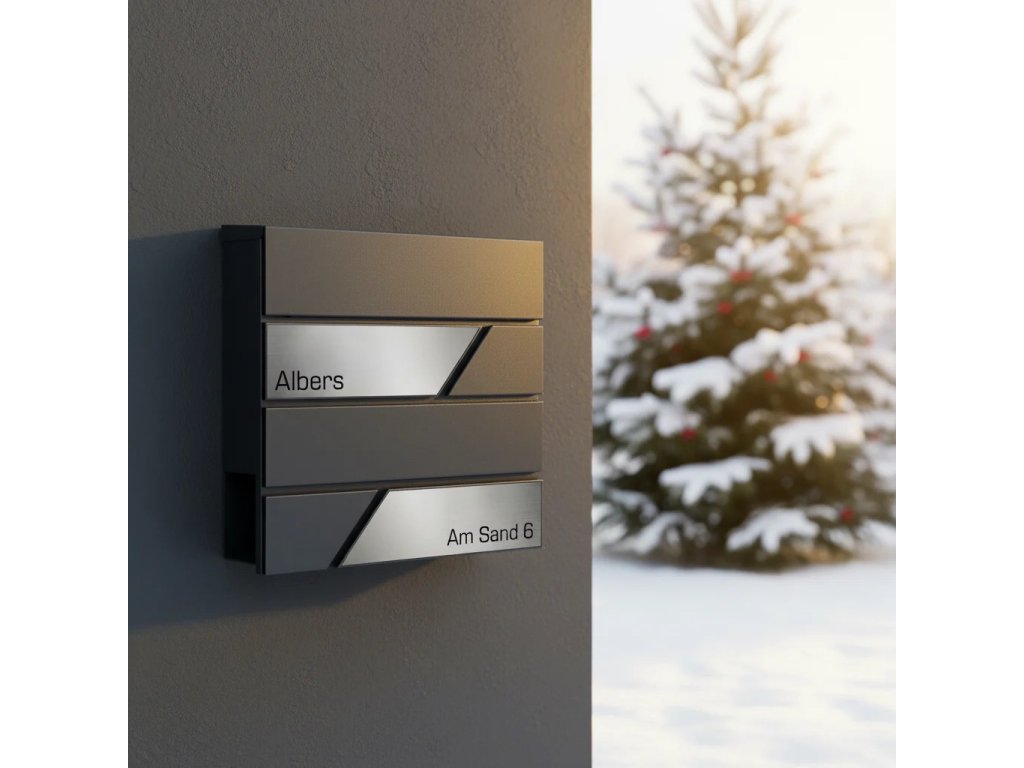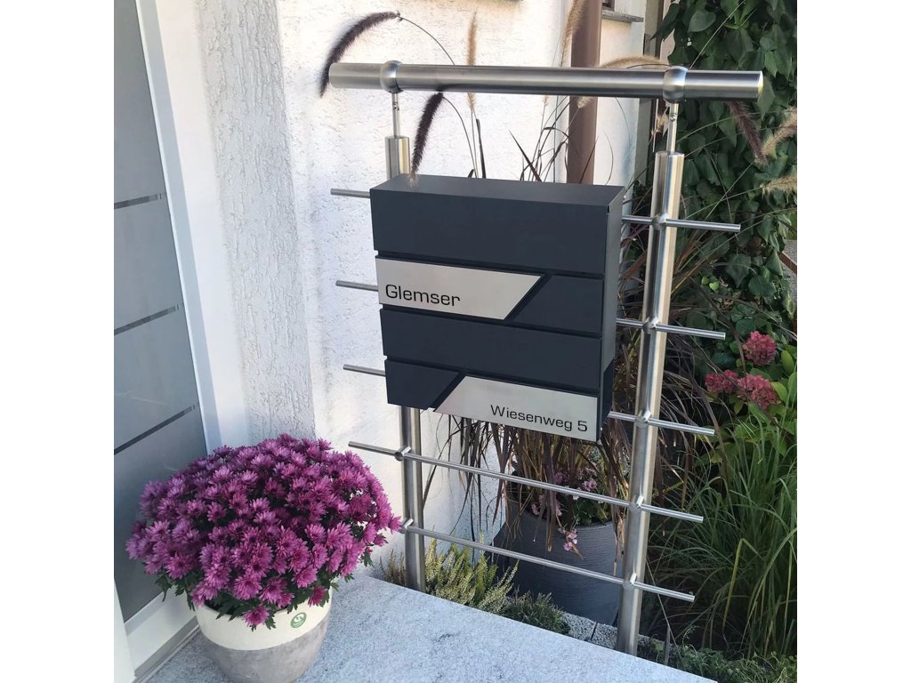 Výrazným prvkem jsou ozdobné lišty z nerezové oceli V2A. Tato konkrétní varianta je dodávána v čistém provedení bez nápisů či personalizace, pouze v elegantní šedé barvě. Schránka nabízí velkorysý vnitřní prostor se širokým vhozem, díky kterému zůstanou i rozměrnější obálky nezmačkané. Ve spodní části se nachází praktický tubus na noviny a letáky, přístupný pohodlně z obou stran. Horní ochranná klopa elegantně kryje vhazovací otvor i samotný zámek, čímž je chrání před deštěm a vlhkostí.