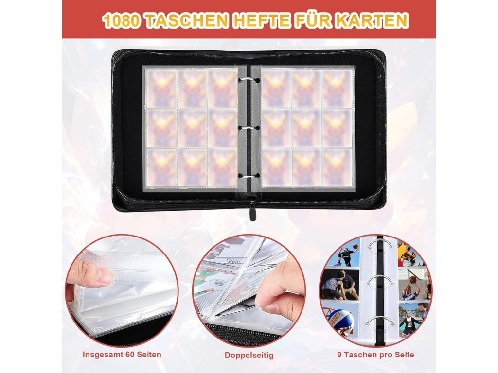Album na sběratelské karty s 9 kapsami na stránku, kapacita 1080 karet. Vodotěsné, odolné EVA/PU, na zip.