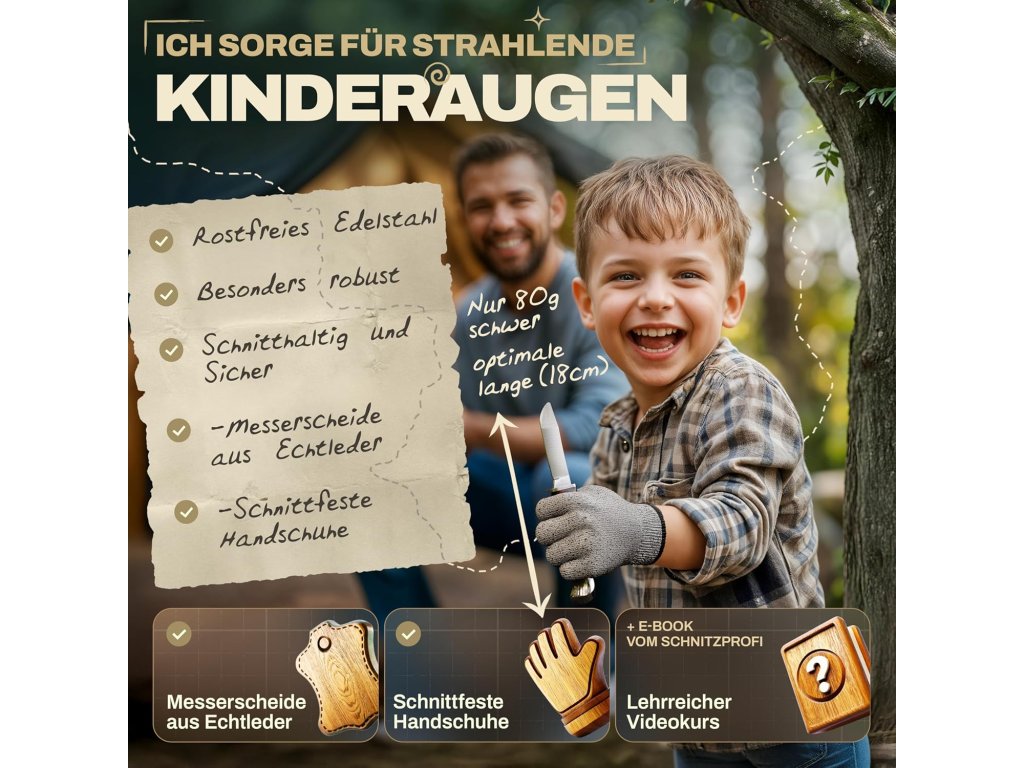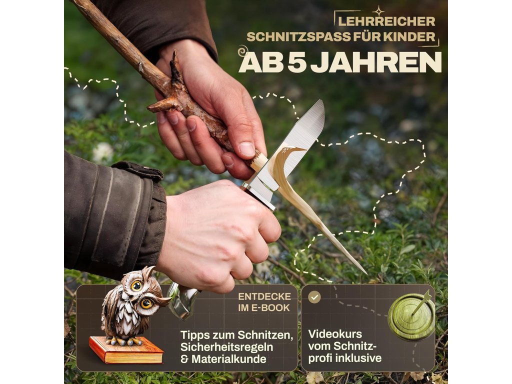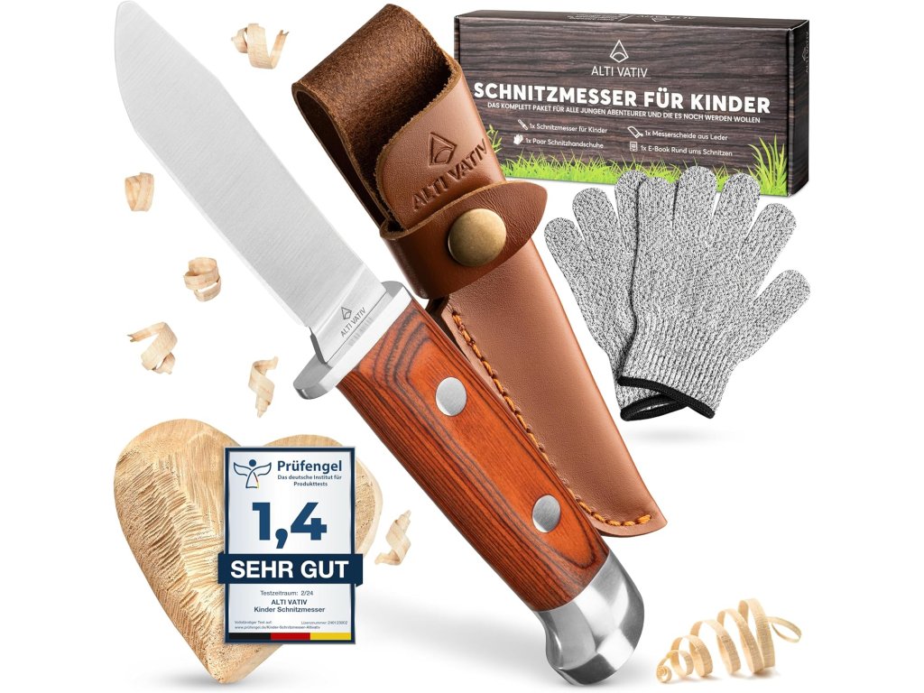 ALTIVATIV řezbářský nůž je kompletní sada pro děti od 5 let, která bezpečně učí řezbářství. Obsahuje kapesní nůž s vhodnou ostrostí, rukavice odolné proti proříznutí (Evropská úroveň ochrany proti proříznutí 5), koženou pochvu na nůž, a navíc video kurz a e-book pro snadné učení. Nůž je vyroben z nerezové oceli 420, která je robustní a odolná.
