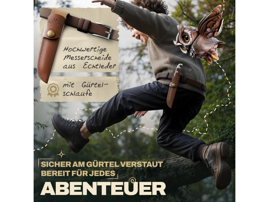 Vysoce kvalitní materiály: Dětský řezbářský nůž je vyroben z nerezové oceli 420, která je obzvláště robustní, nerezavějící a odolná proti proříznutí. Kožená pochva na nůž poskytuje bezpečné a praktické místo pro uložení kapesního nože, čímž chrání jak nůž, tak ruce dítěte.