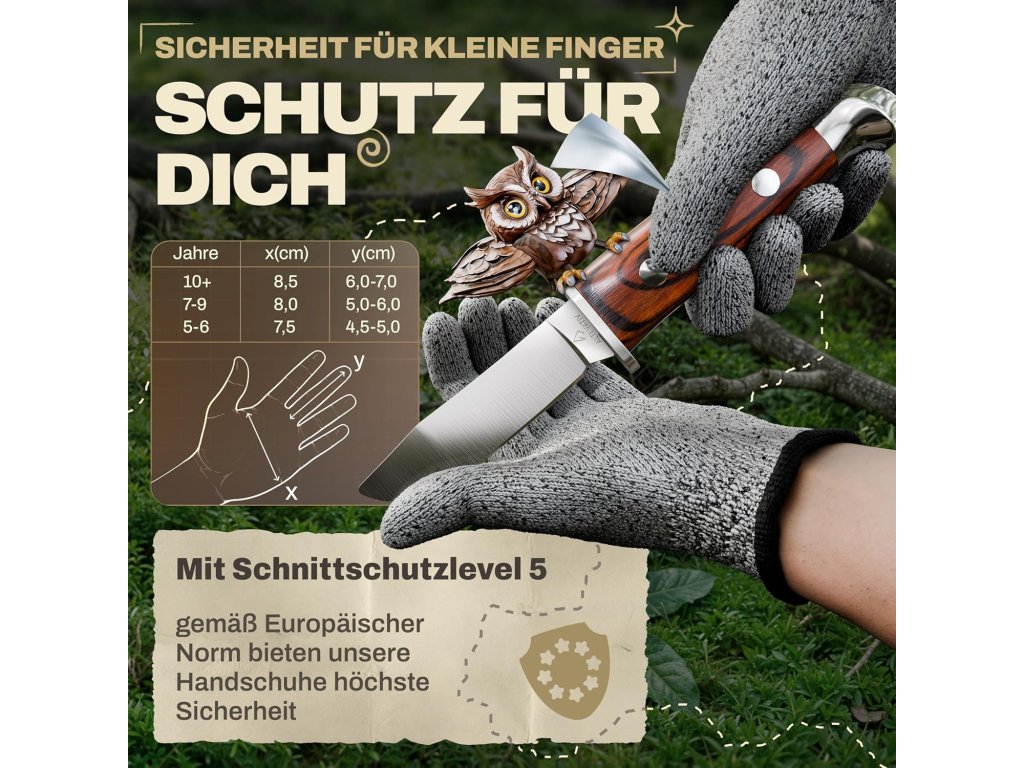 Absolutní bezpečnost na prvním místě: Bezpečnost dítěte je klíčová. Proto je nůž navržen s přiměřenou ostrostí čepele, která zabraňuje nekontrolovatelným řezacím pohybům a minimalizuje riziko zranění. Řezbářské rukavice navíc disponují Evropskou úrovní ochrany proti proříznutí 5 dle normy DIN EN 388, což zajišťuje maximální ochranu rukou.