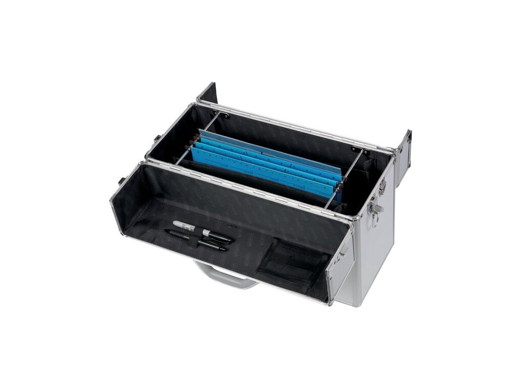 Bezpečnost uložených věcí zajišťuje integrovaný kombinační zámek a spolehlivé boční zapínání na patentky. Vnitřní prostor je uspořádán pro maximální efektivitu, obsahuje přihrádky na vizitky ve víku a praktická poutka na psací potřeby. Pohodlnou manipulaci umožňuje pevné kovové madlo a odnímatelný ramenní popruh, který usnadňuje přenášení na delší vzdálenosti. Hladký povrch v kombinaci s žebrovanými prvky dodává kufru moderní vzhled a snadno se udržuje v čistotě.