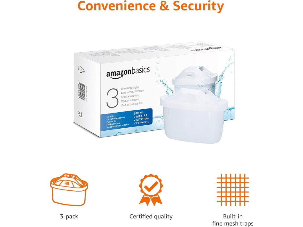Zajistěte si čistější a chutnější vodu z kohoutku s vodními filtračními patronami Amazon Basics! Toto balení obsahuje 3 filtrační patrony, které jsou navrženy pro použití s jakoukoli filtrační konvicí Amazon Basics a jsou plně kompatibilní se všemi novými i starými systémy vodních filtrů BRITA, včetně konvic s technologií PerfectFit.