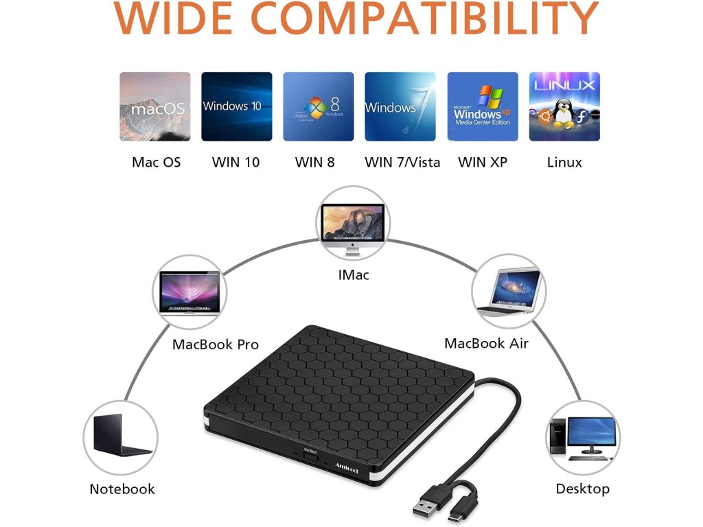S externí DVD mechanikou Amicool si snadno přehraješ filmy, hudbu nebo nainstaluješ programy na svém notebooku, počítači nebo MacBooku, i když nemají vlastní mechaniku! Je kompatibilní se systémy Windows (XP až 10), Linux a všemi verzemi Mac OS. Stačí ji jen připojit do USB portu (USB 3.0 nebo i starší 2.0 a 1.0) a hned funguje, žádné složité instalování ovladačů není potřeba.
