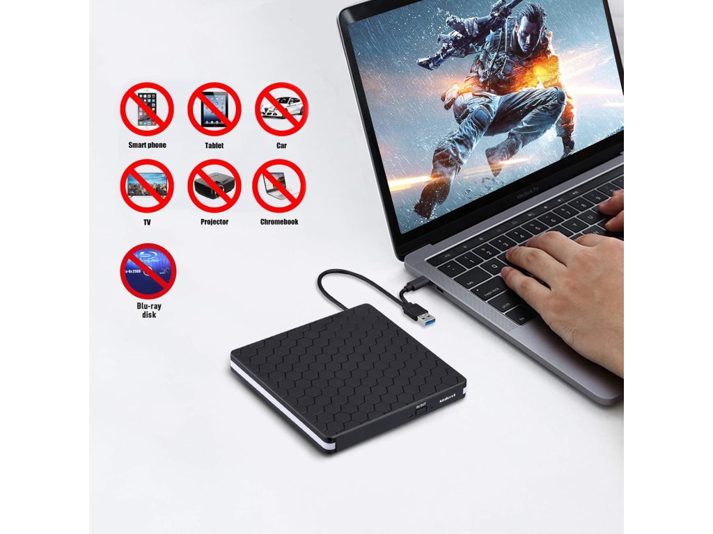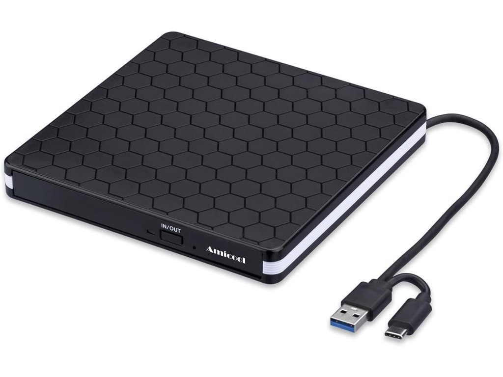 Externí USB 3.0 Type-C DVD mechanika Amicool. Čte a zapisuje CD/DVD, přenosná, pro PC, notebook, MacBook, Windows, Linux, Mac OS.