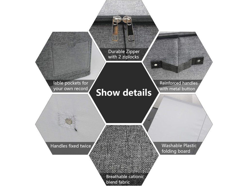 Pevný úložný box AMJ-XL-HBCDX-BG-US v šedé barvě, vyrobený ze speciální kationtové látky a Oxford podšívky s vnitřními plastovými deskami pro udržení tvaru. Má zipové víko, kapsu na štítek a zesílené rukojeti. Rozměry jsou 89 x 42 x 18 cm (35.5 x 16.5 x 7 palců). Je skládací a omyvatelný.