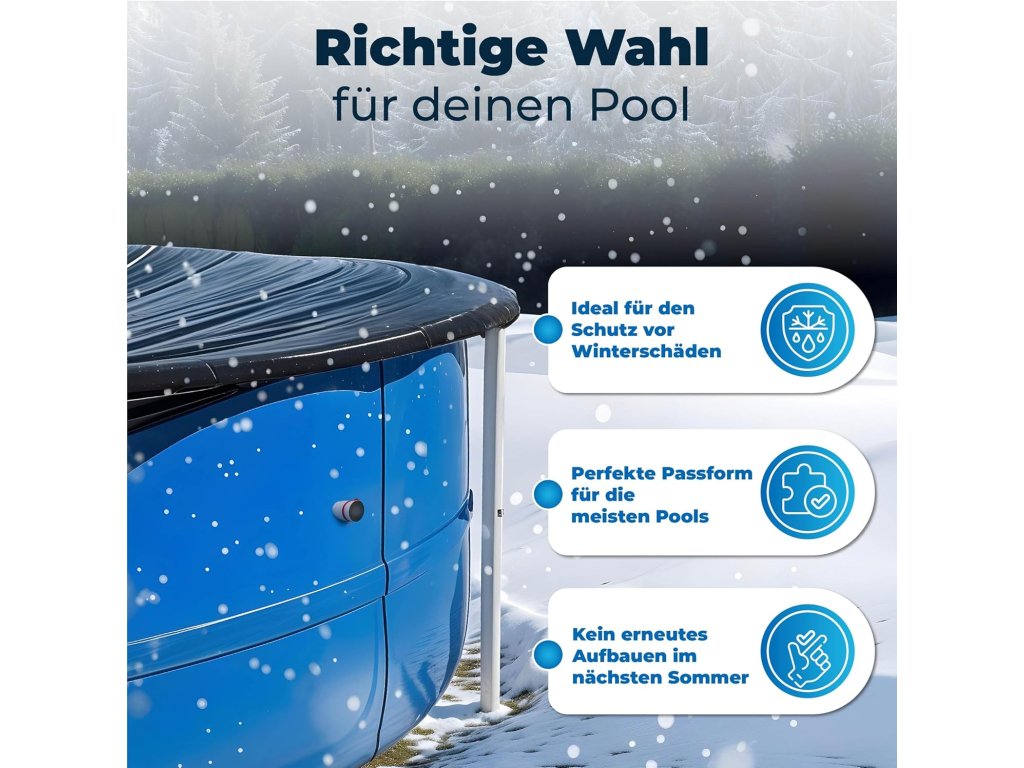Tato sada zimních uzávěrů představuje jednoduché a rychlé řešení pro zazimování nadzemních bazénů. Umožňuje uživatelům ušetřit čas i peníze tím, že minimalizuje nutnost složité demontáže a následné opětovné instalace na jaře.