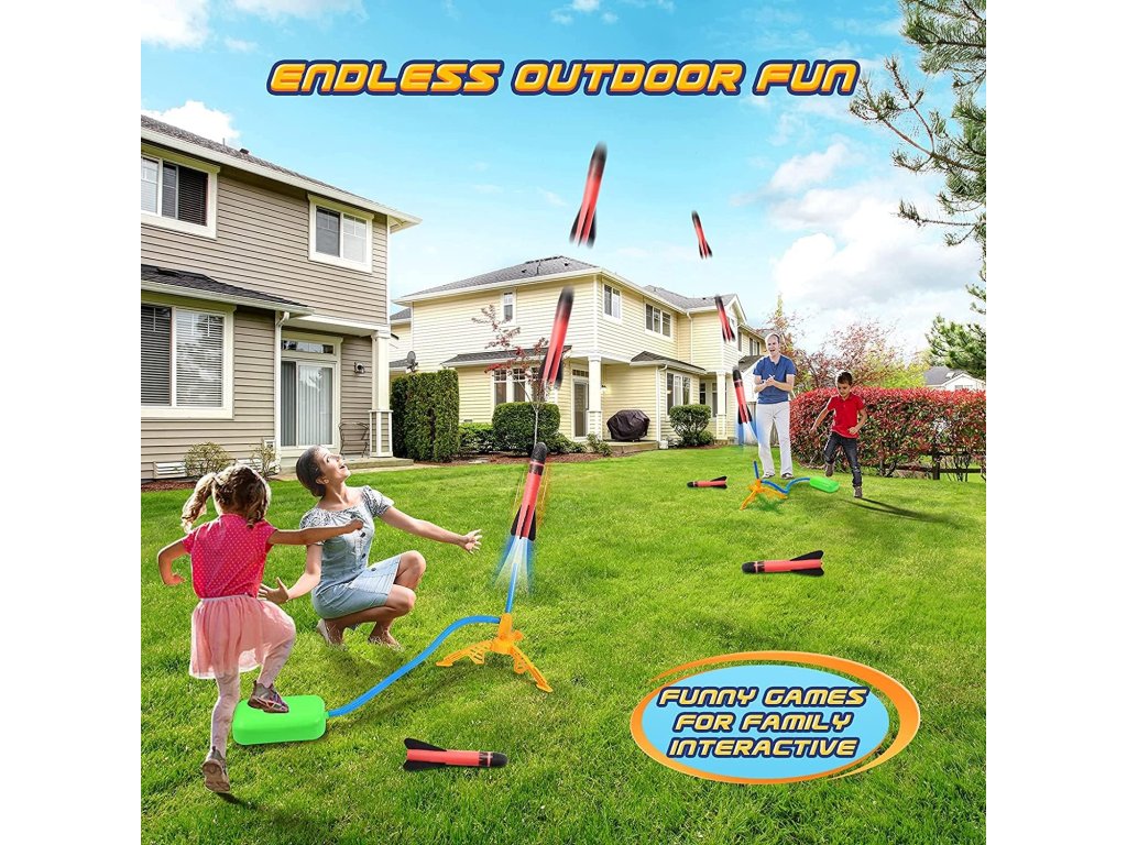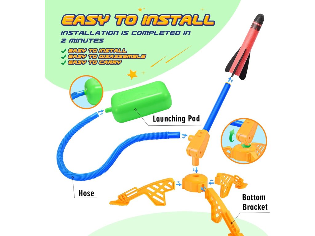 Anginne vzduchová raketa je manuální hračka poháněná šlápnutím na pumpu která je ideální pro venkovní zábavu pro děti ve věku 3–12 let. Sada obsahuje tři odolné pěnové rakety a stabilní trojúhelníkovou základnu která je otočná o 90° pro nastavení úhlu odpalu.