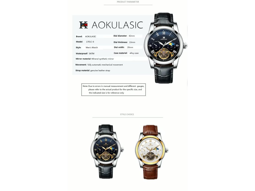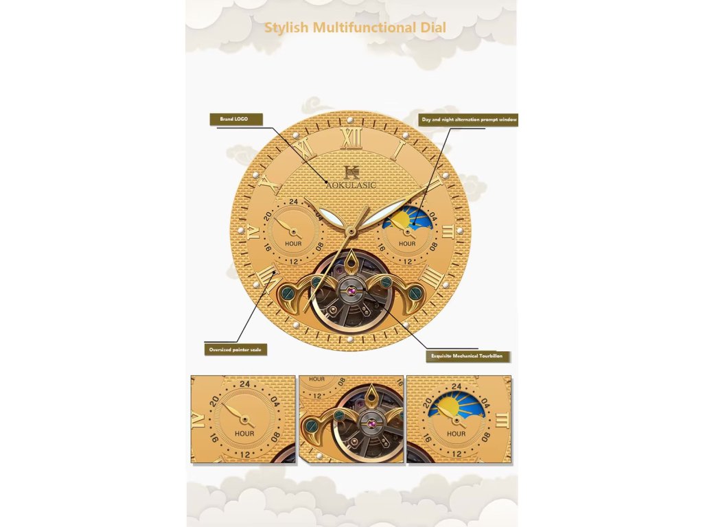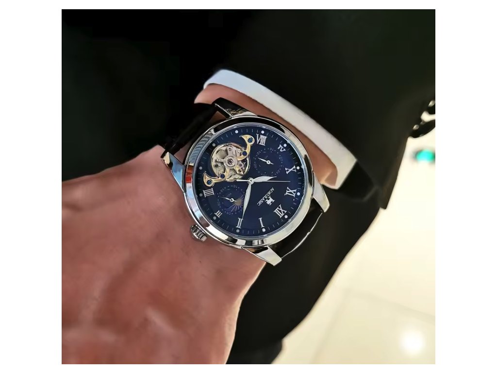 Pánské náramkové hodinky značky Aokulasic jsou osazeny precizním automatickým strojkem s vlastním nátahem, který zajišťuje spolehlivé měření času při běžném pohybu ruky. Ciferník s římskými číslicemi je chráněn odolným sklíčkem Hardlex, které vyniká zvýšenou odolností proti poškrábání a opotřebení. Dominantou vzhledu jsou funkční prvky v podobě tourbillonu a zobrazení měsíčních fází, které hodinkám dodávají nádech sofistikovanosti.
