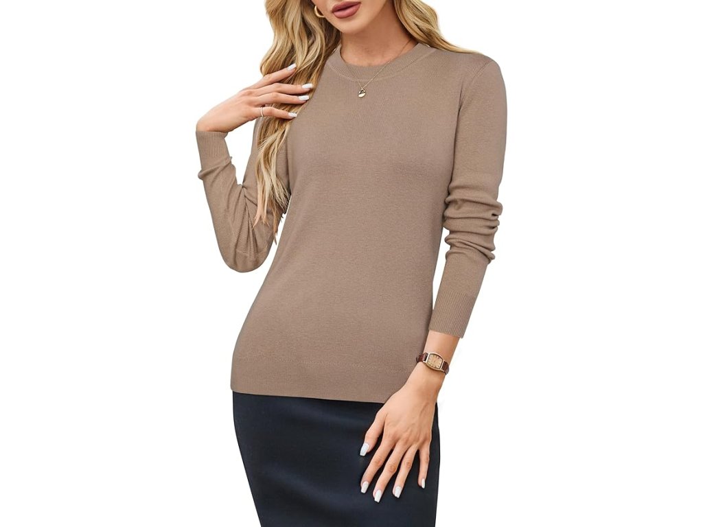 Arach&Cloz dámský pletený svetr s kulatým výstřihem – vlněný blend, dlouhý rukáv, camel (vel. L)