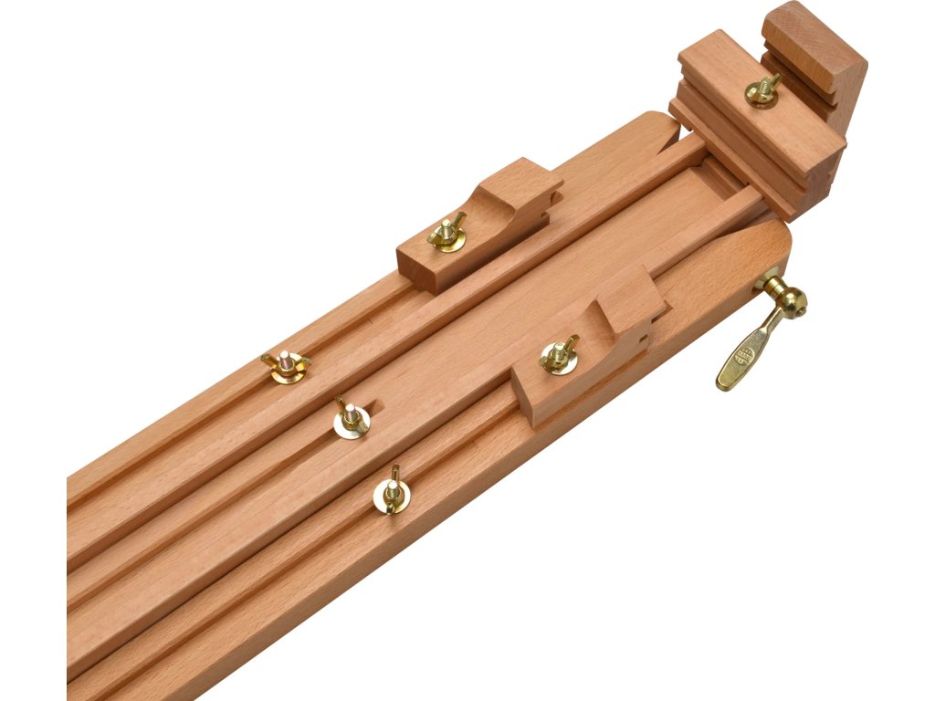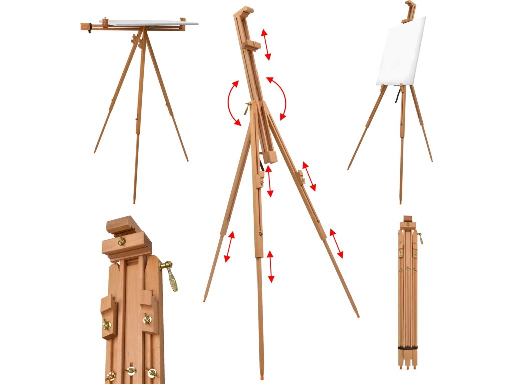 Možnost plynulého nastavení úhlu sklonu až do vodorovné polohy rozšiřuje využití stojanu pro různé techniky malby. Stojan pojme plátna s výškou až 215 cm, díky čemuž najde uplatnění také jako prezentační prvek na svatbách, firemních akcích nebo při otevření nových prodejen. Protiskluzové gumové nožičky zaručují optimální stabilitu na jakémkoliv povrchu. Po skončení práce lze konstrukci snadno složit, což usnadňuje transport a šetří místo při skladování.