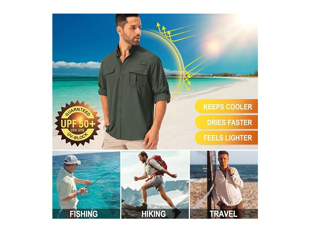 Pánská safari košile Asfixiado je navržena pro outdoorové aktivity, kde je důležitá ochrana před sluncem i pohodlí během pohybu. Materiál s UV ochranou UPF50+ blokuje škodlivé UVA a UVB paprsky a pomáhá chránit pokožku při dlouhém pobytu na slunci.