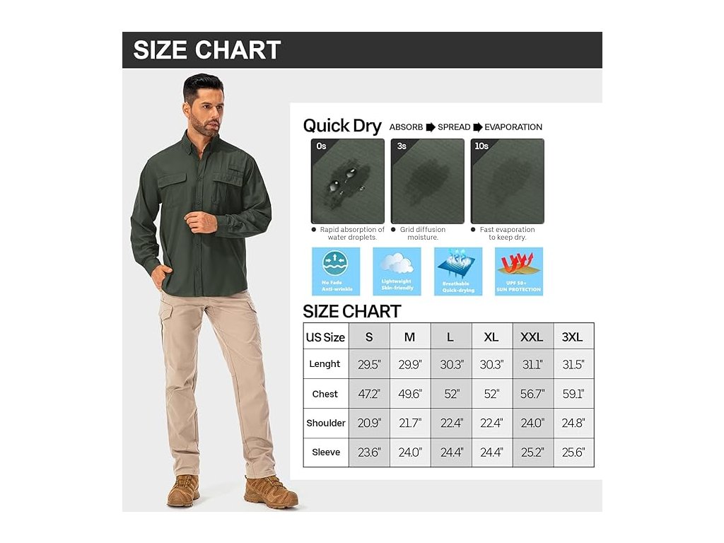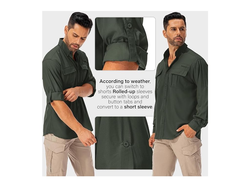 Lehký polyesterový materiál je prodyšný, rychleschnoucí a dobře odvádí vlhkost. Košile má dlouhé rukávy, které lze vyhrnout a upevnit pomocí poutek, takže ji lze snadno přizpůsobit různým podmínkám počasí.
