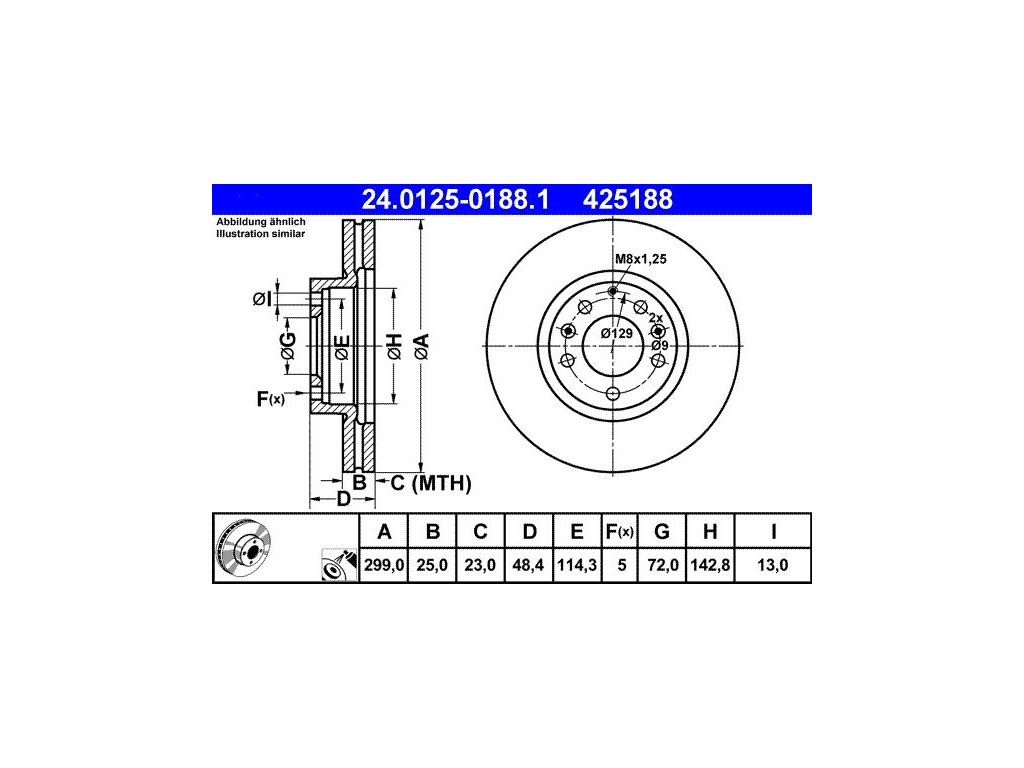 ATE Brzdový kotouč 24.0125-0188.1 (užitné číslo 425188) je větraný brzdový kotouč s nátěrovým povrchem. Má vnější průměr 299 mm, tloušťku 25 mm (minimální tloušťka 23 mm) a 5 děr s kruhovým vyvrtáním 2114,3 mm. Výška kotouče je 48,4 mm, centrovací průměr 72 mm, vnitřní průměr 142,8 mm a průměr díry 13 mm. Je vybaven MAPP kódem.