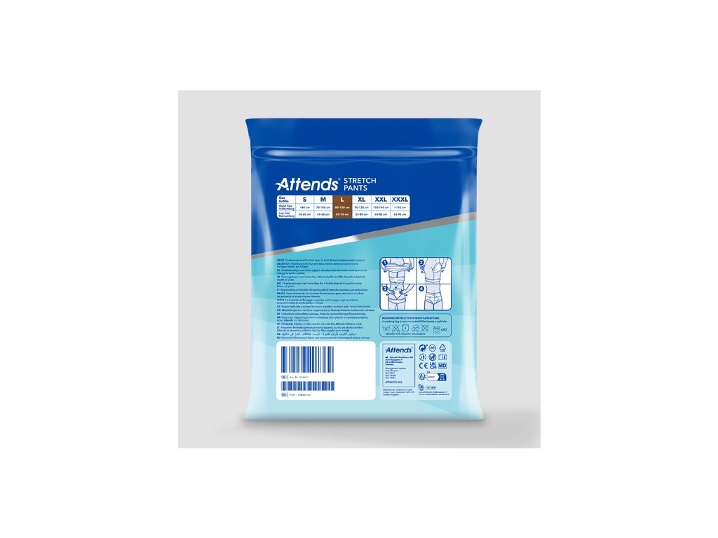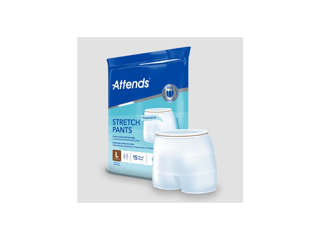 Attends Stretch Pants jsou opakovaně použitelné a pratelné fixační kalhotky s krátkou nohavičkou, které bezpečně udrží vložné pleny Attends na svém místě. Jsou vyrobeny z prodyšného a měkkého elastického materiálu.