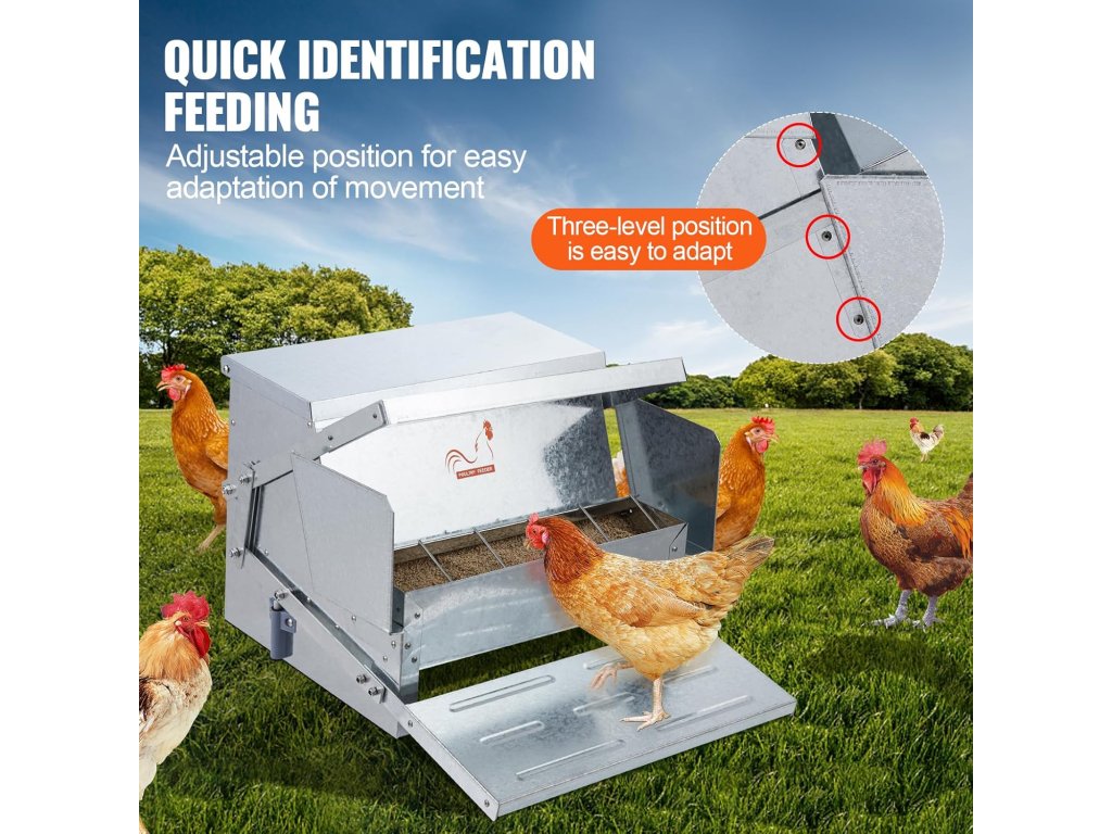 Toto krmítko pojme dostatek krmiva pro 10 kuřat na přibližně 11 dní. Je vybaveno magnetickým zámkem, který zabraňuje divokým ptákům a hlodavcům v přístupu ke krmivu, čímž snižuje plýtvání a náklady. Nášlapný pedál je protiskluzový, což zajišťuje bezpečné a stabilní krmení. Díky třem nastavitelným úhlům a bočním ochranným deskám si drůbež na krmítko rychle zvykne.