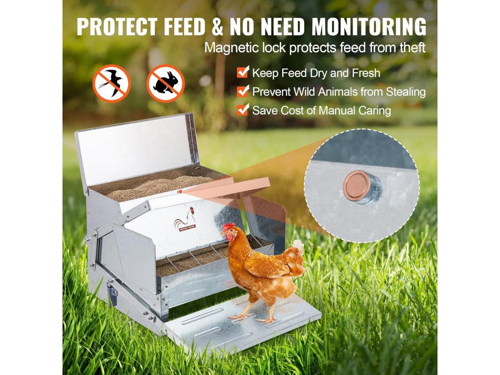 Automatické krmítko VEVOR s kapacitou 25 liber (11 kg) je ideálním řešením pro krmení drůbeže. Je vyrobeno z pozinkované oceli a chrání krmivo před ptáky a hlodavci.