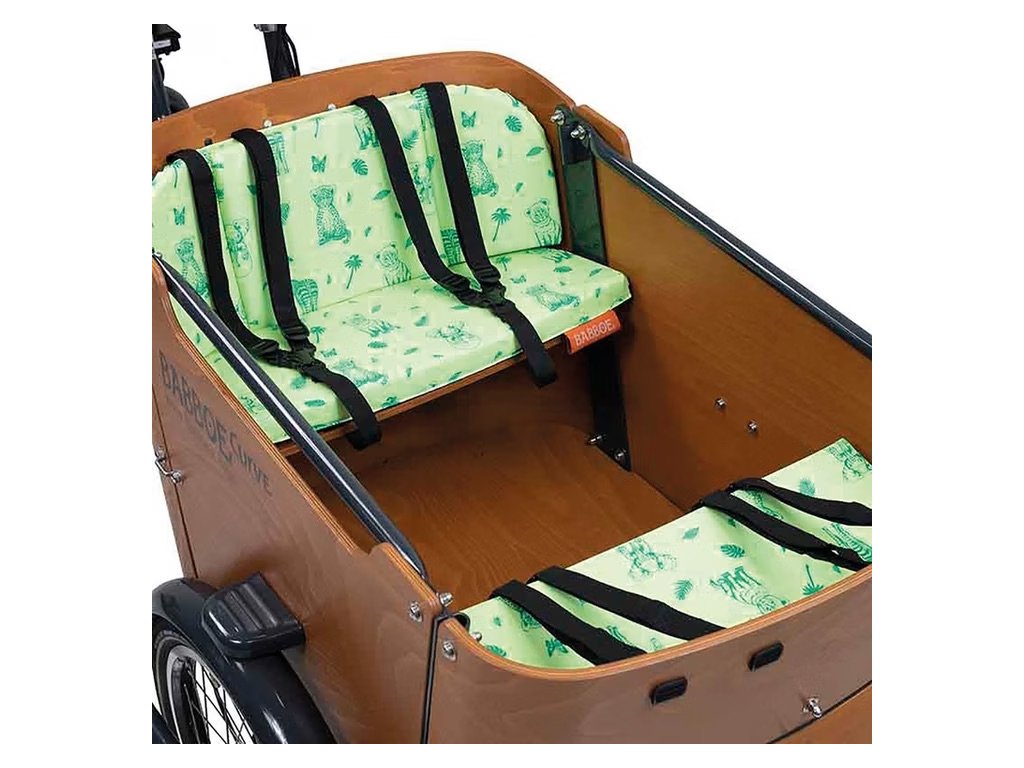 Sada polštářů Babboe Safari Lime určená speciálně pro nákladní kolo (cargo bike) model Babboe Curve. Polštáře slouží jako výplň sedáku a mají osvěžující limetkovou barvu se vzorem Safari.