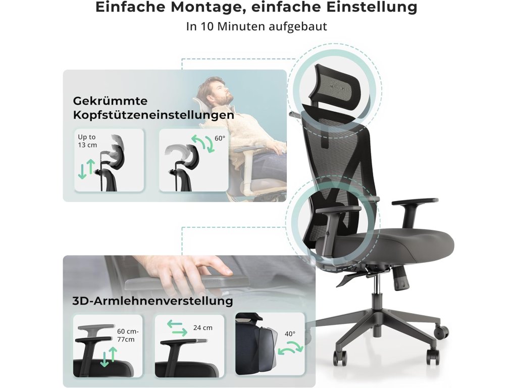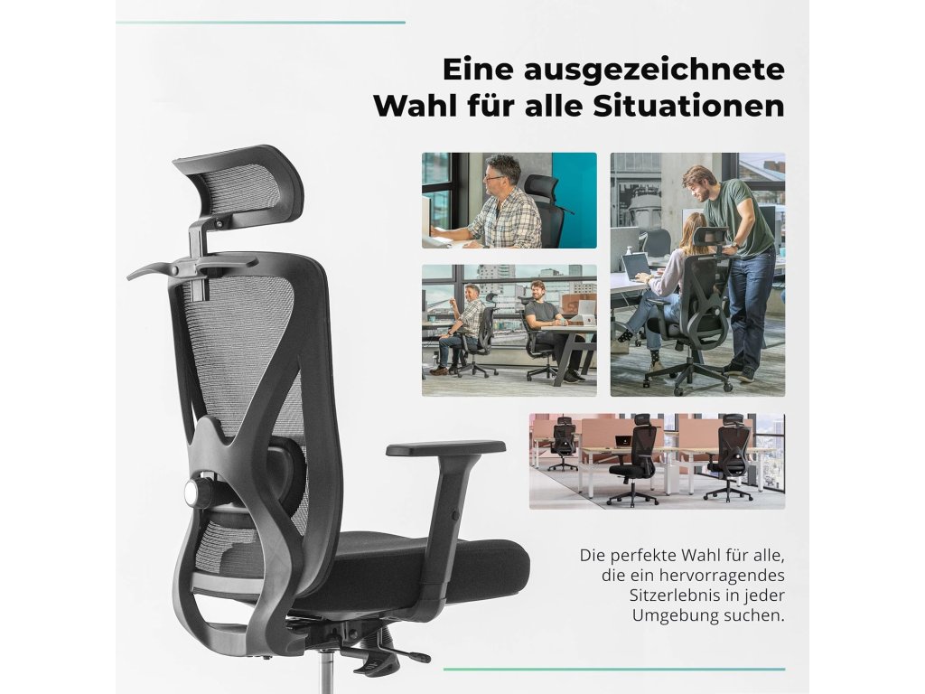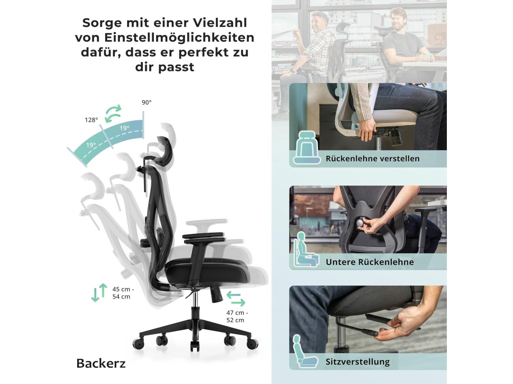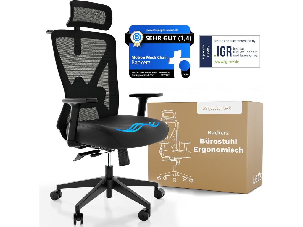 Ergonomická kancelářská židle Backerz v černé barvě je navržena pro maximální komfort při dlouhém sezení a má nosnost až 150 kg. Splňuje certifikace TÜV a NEN 1335 což potvrzuje její vysoké standardy. Židle je vybavena dynamickou prodyšnou síťovanou opěrkou zad nastavitelnou hlavovou opěrkou bederní opěrkou a opěrkami rukou a umožňuje nastavení hloubky a výšky sedáku a sklonu opěradla. Je vhodná pro osoby s výškou 155 cm až 195 cm.