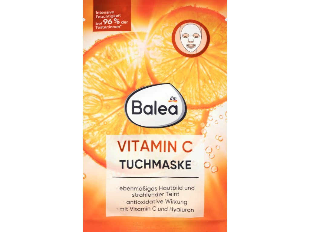 Textilní maska od značky Balea s vitamínem C a kyselinou hyaluronovou sjednocuje tón pleti a dodává jí intenzivní hydrataci a záři.