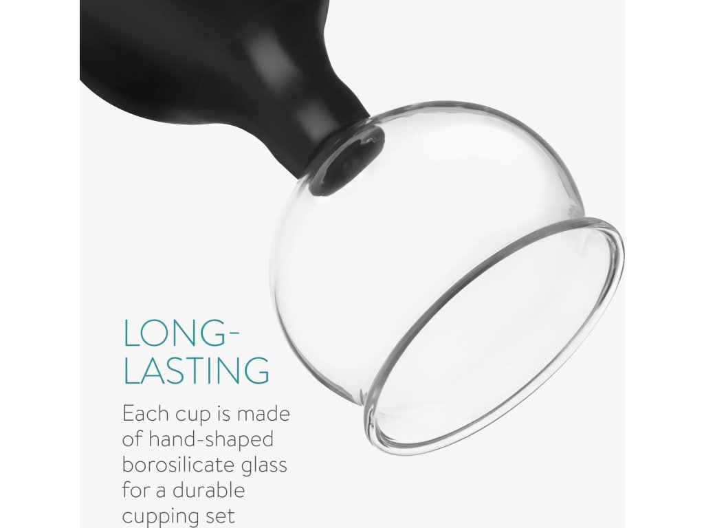 Baňky jsou vyrobeny z borosilikátového skla a pro vytvoření podtlaku slouží praktické přísavné kuličky. Aplikace je snadná: požadovanou partii pokožky nejprve namažte olejem nebo krémem, poté opatrně stiskněte přísavnou kuličku a přiložte baňku na kůži. Postupným uvolňováním kuličky se vytvoří příjemný podtlak s uklidňujícím a uvolňujícím účinkem.
