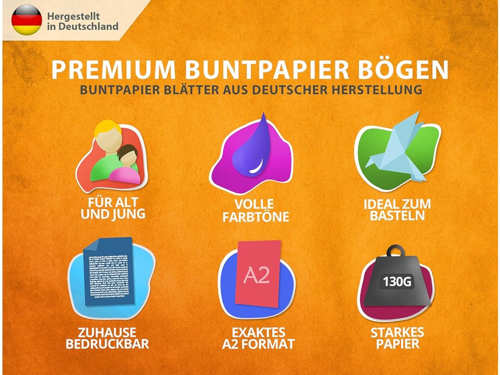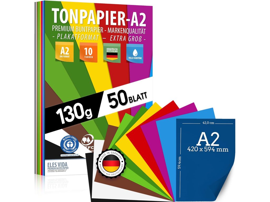 Tato sada 50 listů barevného papíru od značky ELES VIDA je ideální pro všechny kreativní projekty. Papíry mají rozměr DIN A2 a gramáž 130 g/m², takže jsou dostatečně pevné na výrobu přání, figurek, fotoalb a dalších výrobků. Papír je vyroben v Německu a je certifikován značkami Blue Angel a PEFC, které garantují udržitelné lesní hospodaření.