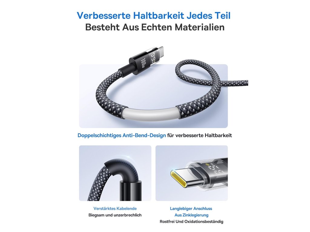 Hledáte odolný a rychlý kabel pro vaše moderní zařízení? Tento 100W USB-C kabel je navržen tak, aby vyhovoval nárokům na rychlé a efektivní nabíjení. Klíčovou funkcí je jeho digitální displej, který vám na první pohled ukáže aktuální výkon. Už nemusíte hádat, jestli se vaše zařízení nabíjí rychle. Kabel je vybaven zesíleným měděným jádrem a inteligentním čipem E-Marker, který chrání baterii vašeho zařízení před přetížením. Díky zesíleným konektorům a dvouvrstvému designu kabel odolá každodennímu opotřebení a ohýbání, takže si můžete být jisti, že vydrží dlouho.