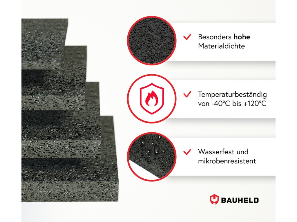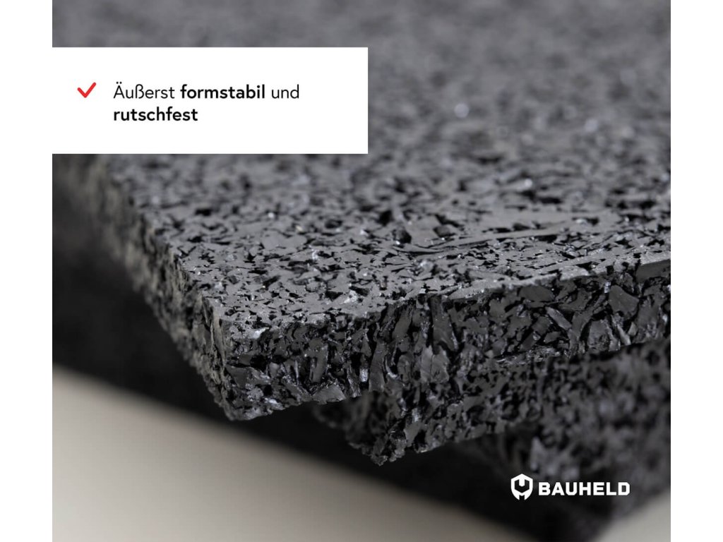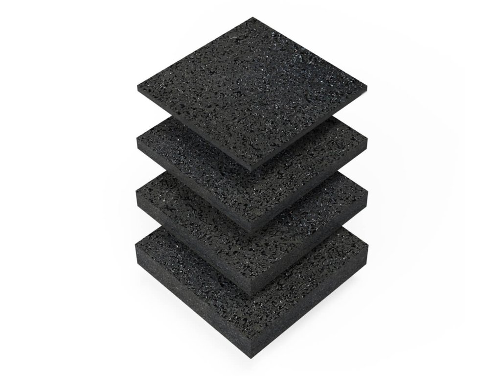 Sada 55 terasových podložek Bauheld o rozměrech 90 x 90 x 3 mm. Vyrobené z recyklované pryže, odolné a voděodolné.
