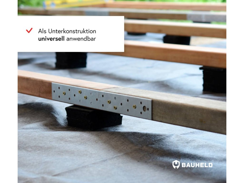 S těmito terasovými podložkami Bauheld bude stavba terasy hračka! Jsou vyrobené z kvalitní recyklované pryže, takže jsou šetrné k přírodě a zároveň hodně odolné. Nebojí se škrábanců, roztržení ani nárazů a zvládnou i různé počasí, včetně vody. Můžeš je použít jako podklad pod terasová prkna, kameny nebo podstavce a pomůžou ti terasu pěkně vyrovnat. Pokud potřebuješ menší kousky, snadno je nařežeš běžným nožem. V balení najdeš 55 kusů podložek.