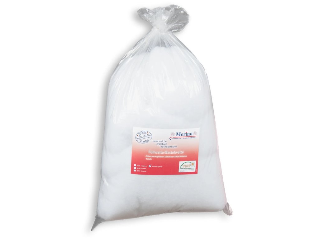 Bavlněná výplň v balení 3000 gramů je ideální pro ruční práce jako je plnění polštářů plyšových zvířátek panenek a dalších předmětů. Výplň je vyrobena ze 100% polyesterových vláken v Německu a je certifikována dle normy OekoTex Standard 100 což zaručuje zdravotní nezávadnost. Materiál je vysoce objemný rozměrově stabilní a odolný. Lze jej prát až do 60 °C.