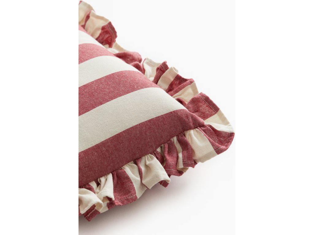 Sedák má elegantní design s volánkem a pruhovaným vzorem v tmavě červené a přírodně bílé barvě, který se hodí do každého interiéru. Je vyroben z kvalitních a udržitelných materiálů, přičemž vnější vrstva je ze 100% bavlny a výplň obsahuje vysoký podíl recyklovaného polyesteru a bavlny.