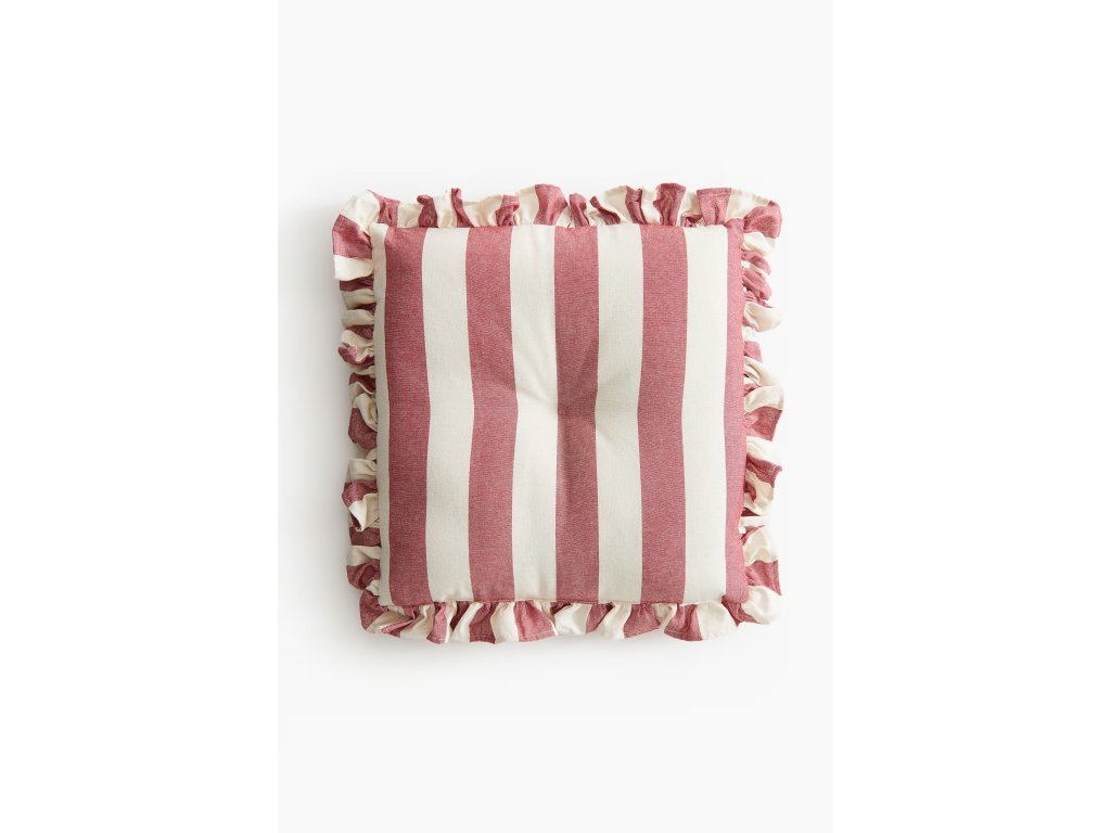 Tento polstrovaný sedák o rozměrech 40 x 40 cm je vyroben z měkké bavlněné tkaniny. Sedák s tmavě červeným a přírodně bílým pruhovaným vzorem je lemován elegantním volánkem a uvnitř je vyplněn recyklovaným polyesterem. Je skvělým doplňkem do kuchyně nebo jídelny.