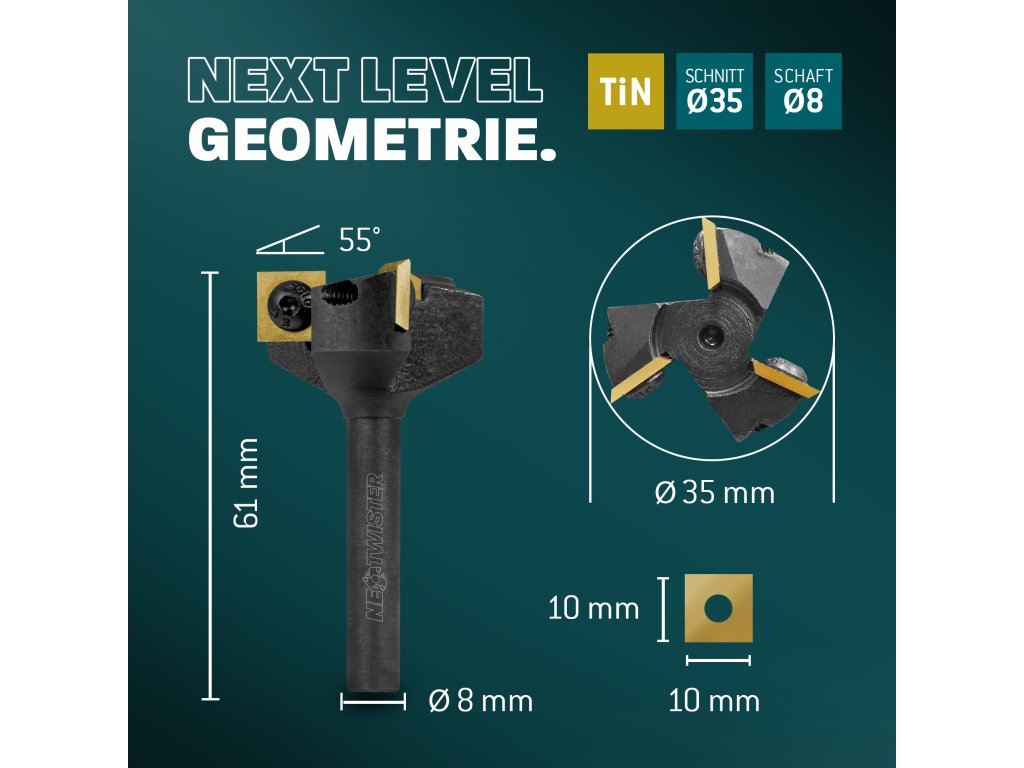 Bayerwald Tools NeoTwister Ø 35 mm - posuňte své frézování na novou úroveň: Tato profesionální čelní fréza Bayerwald NeoTwister s průměrem řezu 35 mm je ideální pro čelní frézování, drážkování a opracování hran různých materiálů. Díky hřídeli o průměru 8 mm je kompatibilní s ručními frézkami i CNC stroji bez nutnosti dalšího příslušenství.