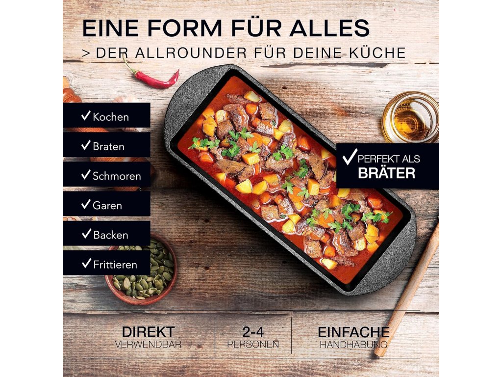 Obsah balení litinová forma, litinová poklice, 2x silikonový chránič rukojetí, kniha receptů