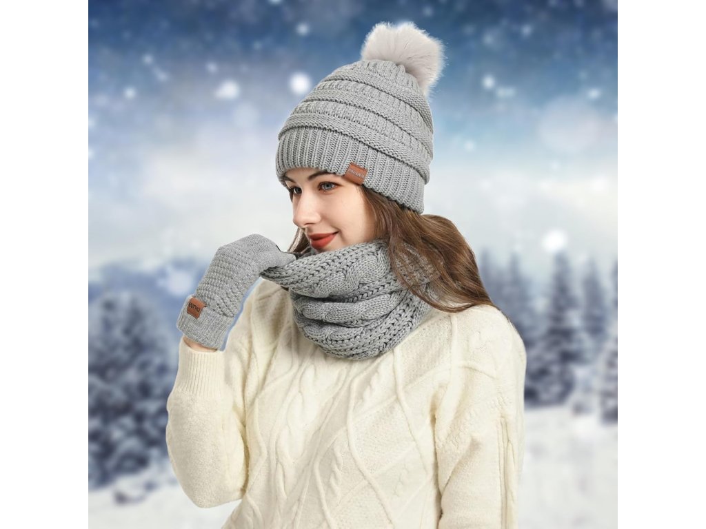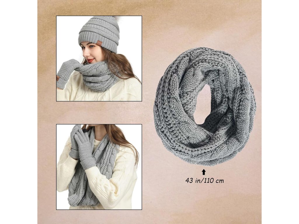 Tato dámská zimní sada 5 v 1 nabízí kompletní ochranu před chladem. Pletená čepice s bambulí a šála jsou vyrobeny ze silného, měkkého akrylu, který poskytuje teplo a pohodlí. Elastický úplet dobře přiléhá k hlavě i krku a pomáhá chránit před studeným větrem.
