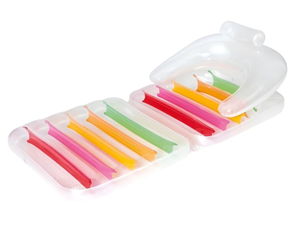 Bestway Nafukovací lehátko High Fashion Chair je transparentní s barevnými pruhy a má rozměry 201x89x84 cm. Je vyrobeno z 0,24 mm vinylu, disponuje 3 nafukovacími komorami a lze jej přehnout do podoby křesla. Vhodné je pro děti i dospělé od 10 let a součástí balení je opravná sada.