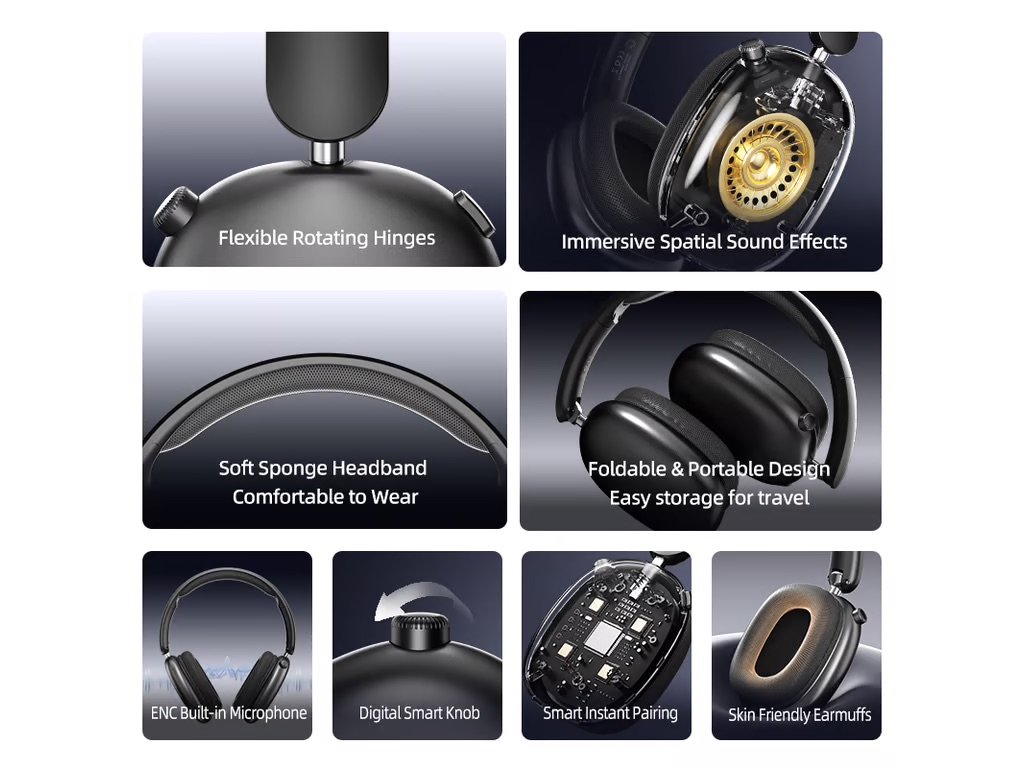 Sluchátka jsou vybavena integrovaným mikrofonem s funkcí ENC, která během telefonních hovorů aktivně potlačuje okolní hluk a zajišťuje čistý přenos hlasu. Praktický skládací a otočný mechanismus umožňuje sluchátka snadno složit naplocho, což výrazně usnadňuje jejich přenášení v zavazadle. Vestavěná baterie s kapacitou 300 mAh zaručuje až 20 hodin provozu na jedno nabití, přičemž inteligentní párování zajistí okamžité připojení k vašemu telefonu, tabletu nebo počítači ihned po zapnutí.