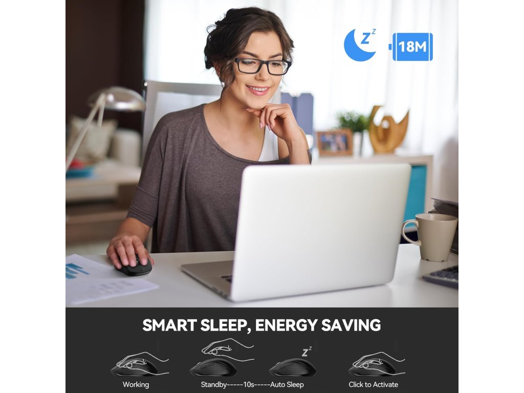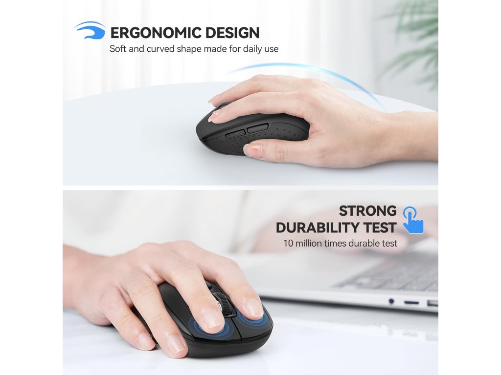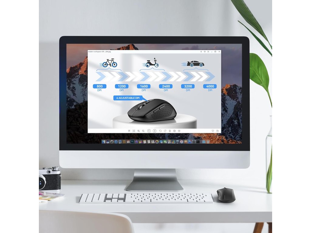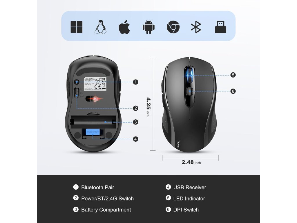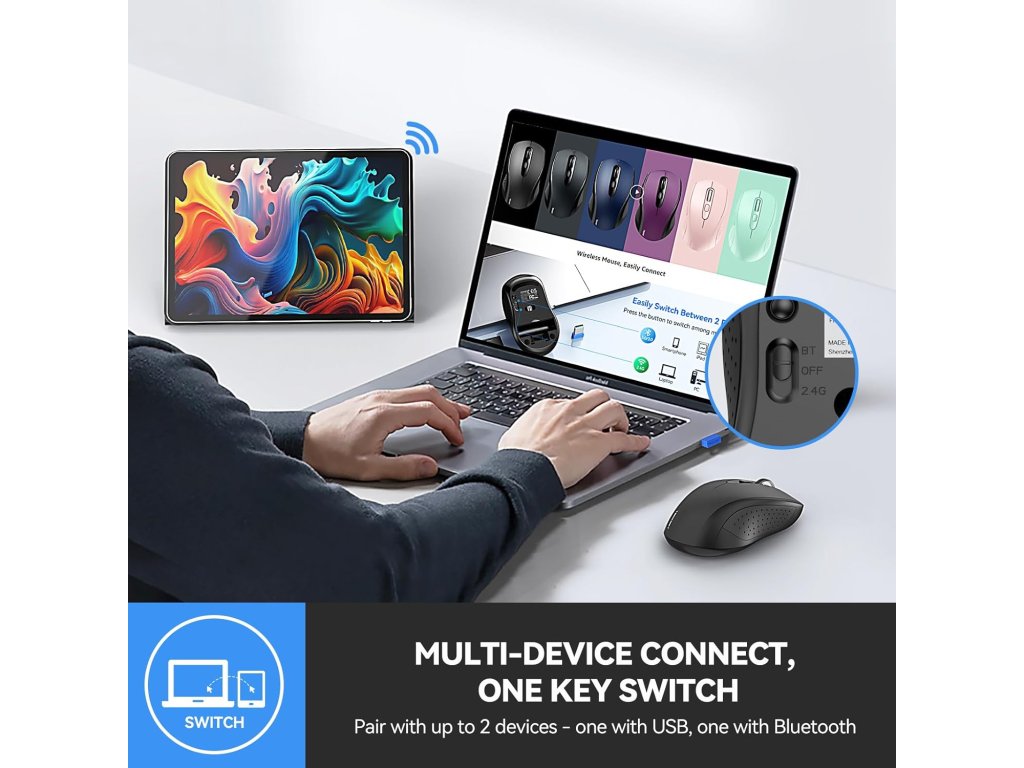S touhle myší bude ovládání tvého počítače nebo notebooku super snadné! Je totiž bezdrátová, takže ti nebude překážet žádný kabel. A co je na ní nejlepší? Umí se připojit hned dvěma způsoby! Buď přes Bluetooth (to je taková bezdrátová technologie, jako když máš bezdrátová sluchátka) a nebo pomocí malého USB "tyčinky", kterou strčíš do počítače. Takže ji můžeš používat s různými zařízeními.