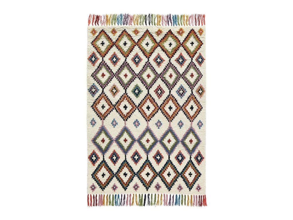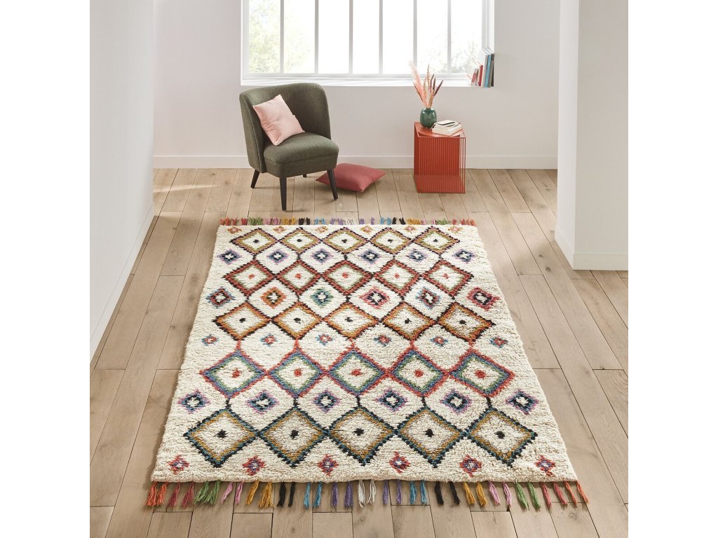Berberský koberec Ourika je pohodlný, exotický a kompletně ručně pletený klenot z Francie, od značky Redouta. Je navržen tak, aby dodal vašemu interiéru nádech útulnosti a originality díky svému zářivému diamantovému vzoru a vícebarevnému provedení.