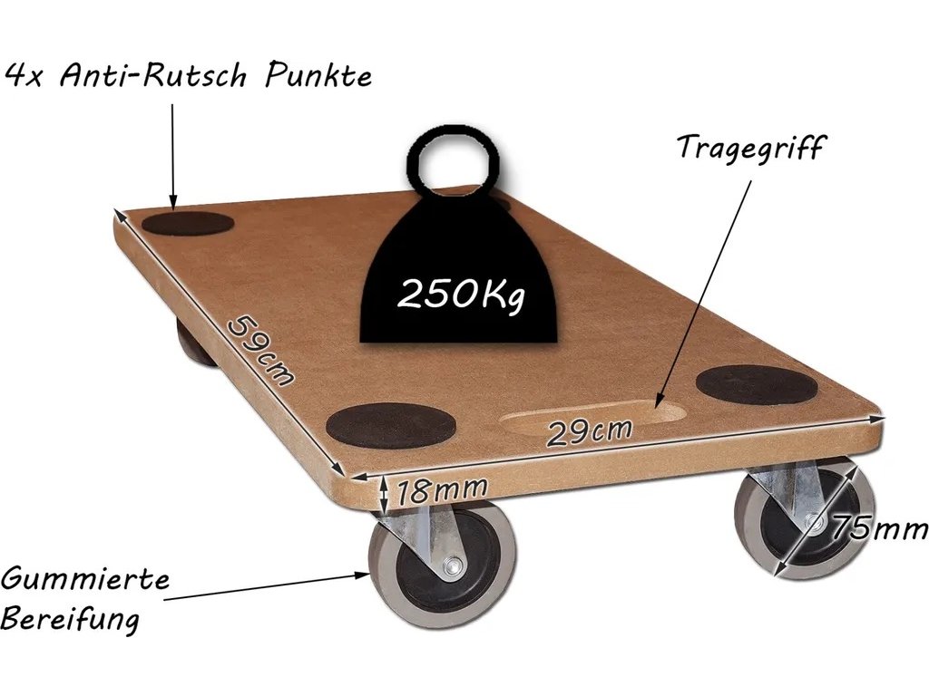 Tato přepravní deska od BigDean je nepostradatelnou pomůckou při jakémkoliv stěhování zařizování domova nebo práci v dílně. Umožňuje snadnou a bezpečnou přepravu těžkého a neskladného nábytku bez zbytečné námahy. Vysoká nosnost a bezpečnost Deska je navržena pro maximální zatížení 250 kg což bezpečně pokryje většinu těžkého nábytku. Pro zajištění bezpečné přepravy je deska vybavena čtyřmi protiskluzovými body které pevně drží náklad na místě. Odolná konstrukce Přepravní deska je vyrobena z odolné MDF desky o tloušťce 18 mm což zaručuje její pevnost a dlouhou životnost. Kolečka o průměru 75 mm jsou vyrobena ze speciální směsi plast a pryž PP což zajišťuje extrémní robustnost a snadnou manipulaci i při přejíždění menších nerovností v podlaze.Celkové rozměry válečku jsou 59 cm x 29 cm x 9,5 cm (délka x šířka x výška) což představuje ideální velikost pro většinu kusů nábytku.