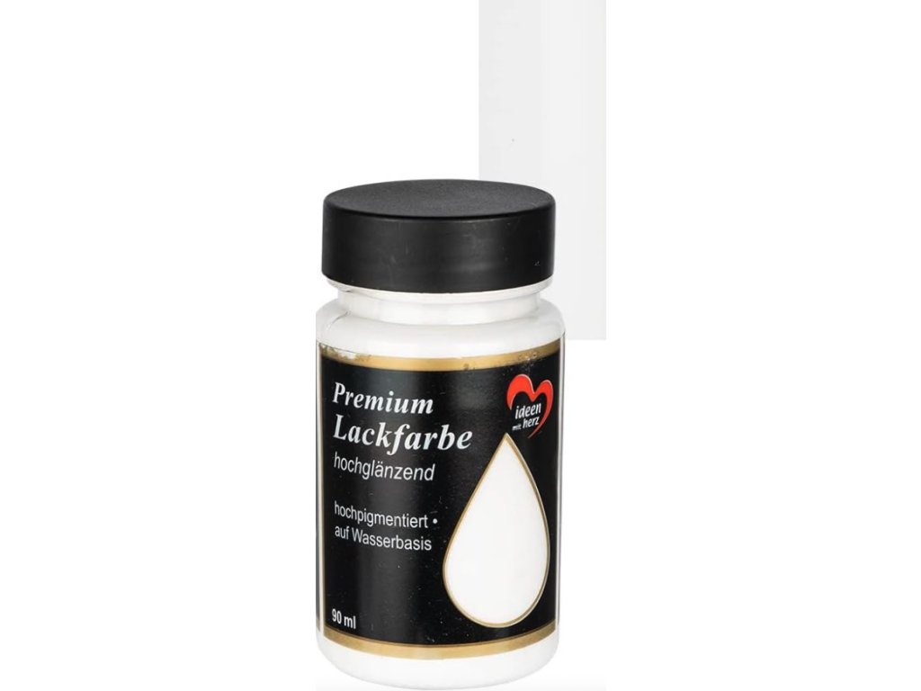 Laková barva Ideas with Heart Premium je vysoce lesklá, vysoce pigmentovaná barva na vodní bázi s vynikající kryvostí v bílé barvě (90 ml). Je ideální na dřevo, polystyren, plast, sklo, keramiku a mnoho dalších povrchů. Lze ji snadno nanášet bez šmouh, je vhodná pro vnitřní použití a poskytuje odhadovanou vydatnost 15–30 m²/litr.
