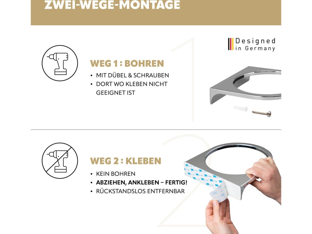 - Montáž držáku: Lepení (3M VHB) nebo vrtání (hmoždinky a šrouby součástí balení)
